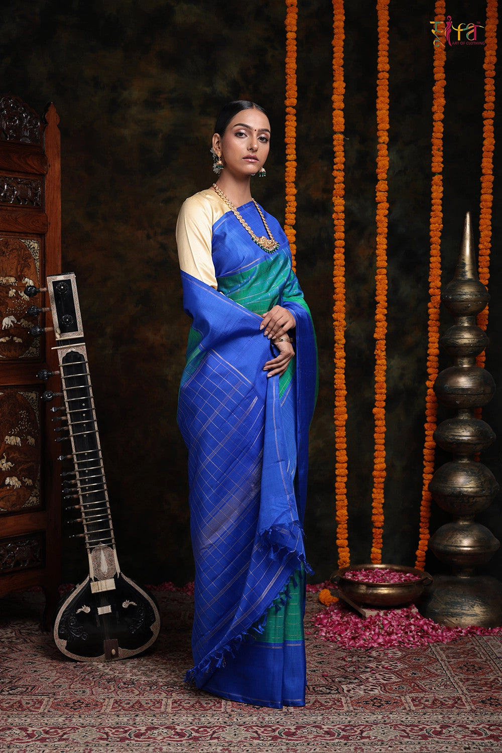 Handloom Duo Tone Green Pure Silk Kanjeevaram With Zari Check Body And Blue Border