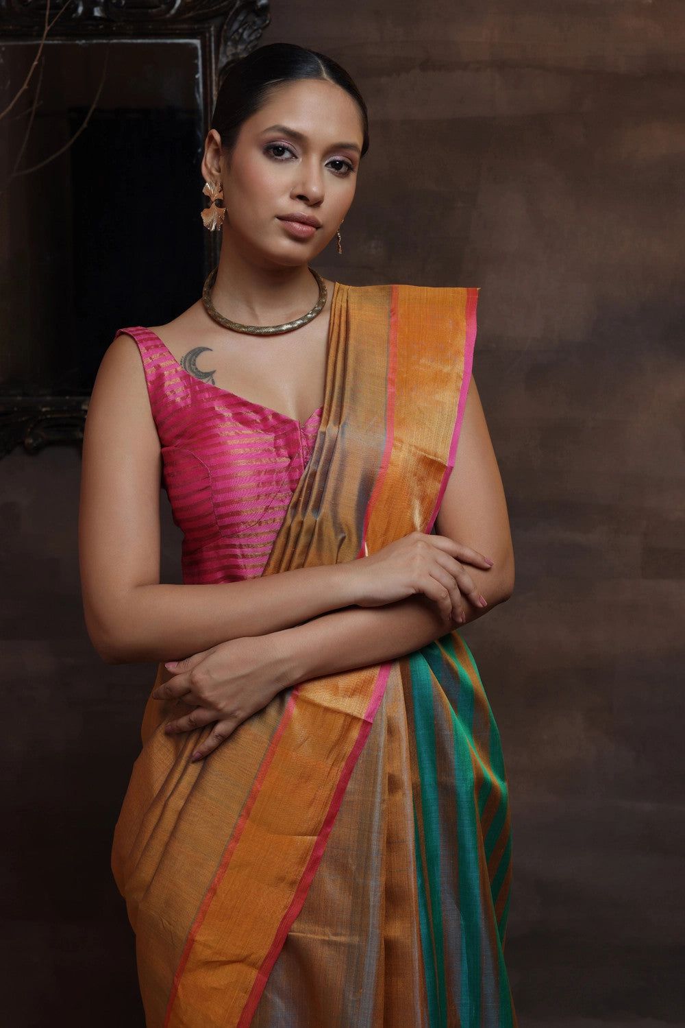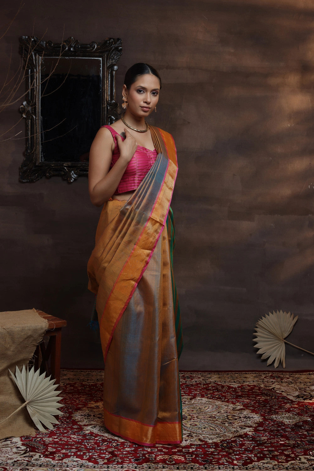 Handloom Gold Duo Tone Pure Silk Saree With Contrasting Border And Pallu