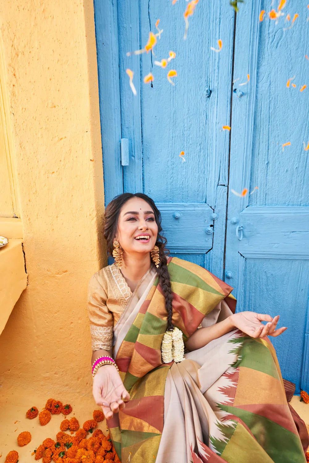 Step into the realm of timeless elegance with our Handloom Gold Pure Silk Kanchi Saree, a masterpiece of craftsmanship and luxury. Adorned with a stunning double Temple border in vibrant multi-color hues, this saree exudes opulence and grace. Crafted with meticulous attention to detail, it captures the essence of tradition while embracing contemporary allure. Indulge in the rich heritage of Indian handloom artistry, draped in the finest silk, and elevate your style with this exquisite creation. Make a statement of sophistication and cultural richness with this breathtaking attire.