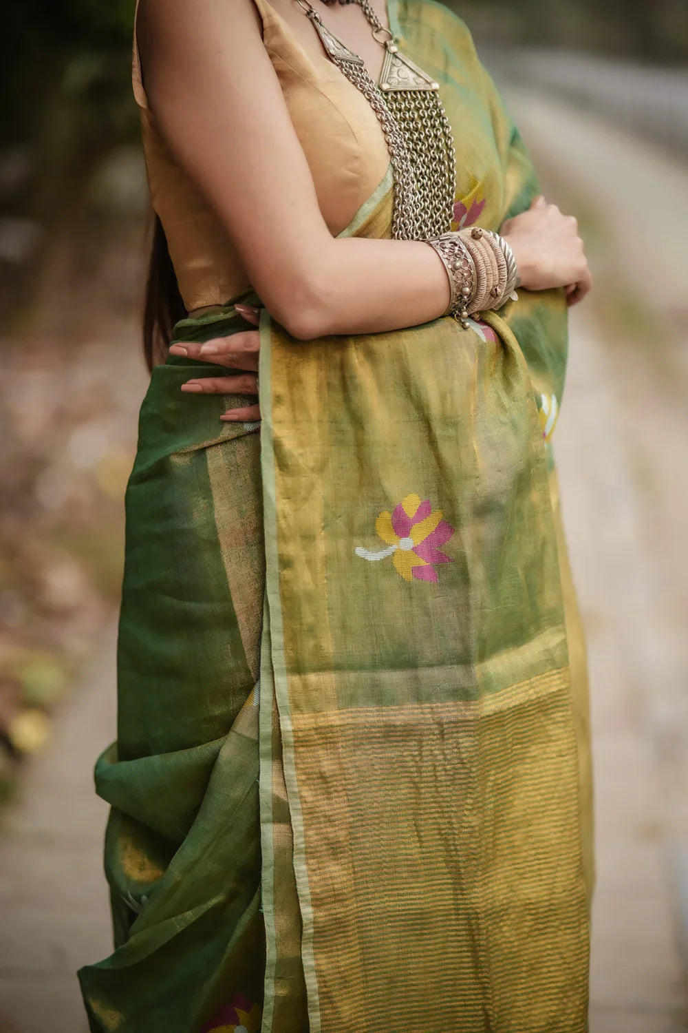 Handloom Green & Gold Tissue Linen Jamdani Saree