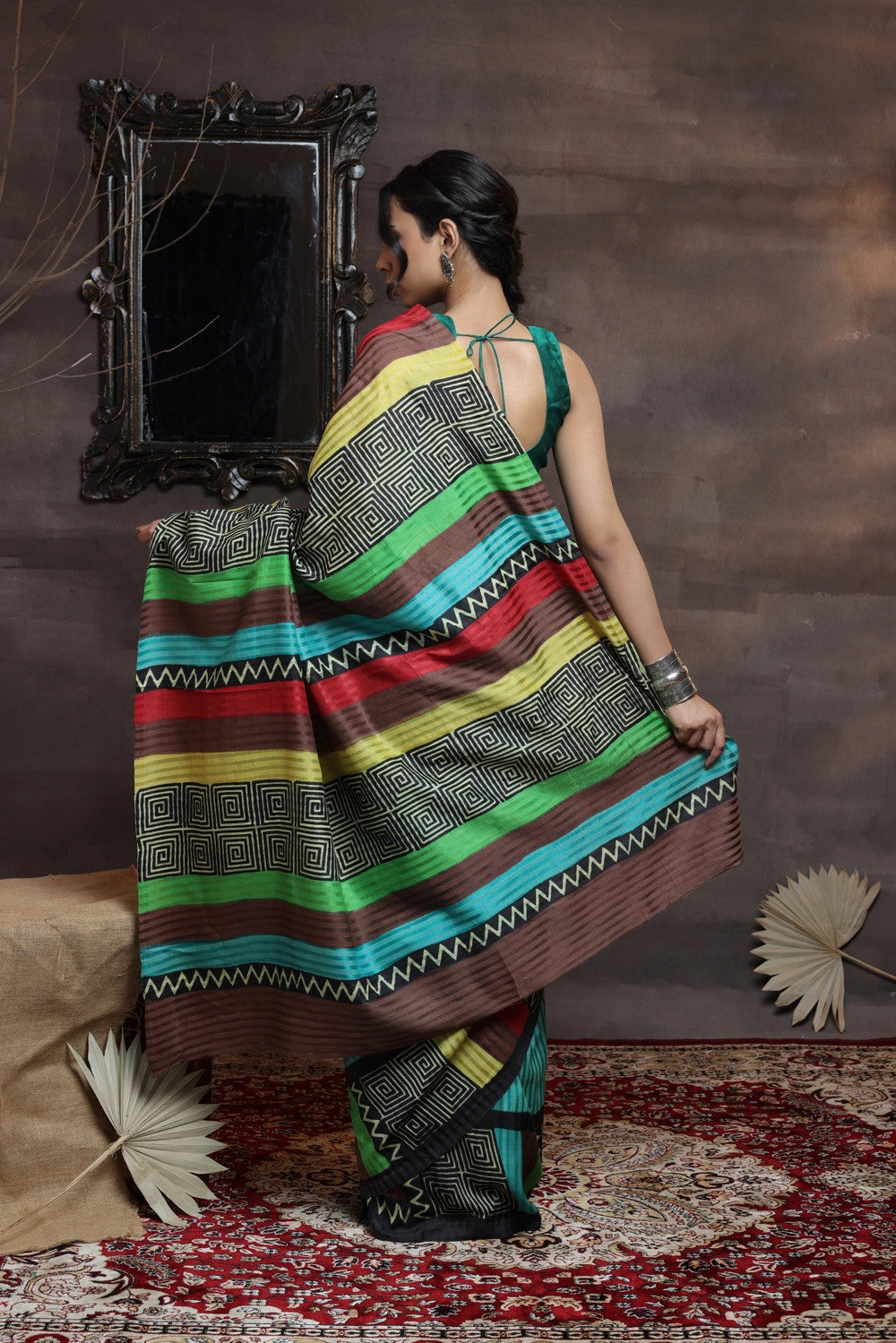 Celebrate artistic brilliance with our Green Hand Painted Handwoven Saree in pure silk. A fusion of traditional artistry and contemporary design, this vibrant masterpiece features multi-color patterns in red, yellow, and brown hues. The elegant black border adds sophistication. Versatile for any occasion, pair it with the same saree blouse or contrast it with antique jewellery to complete your personalized look. Embrace the comfort of pure silk and shine with grace and charm at every event, as this saree reflects the beauty of culture and craftsmanship. Step into the spotlight with this timeless and captivating ensemble.