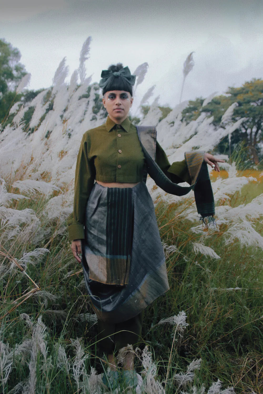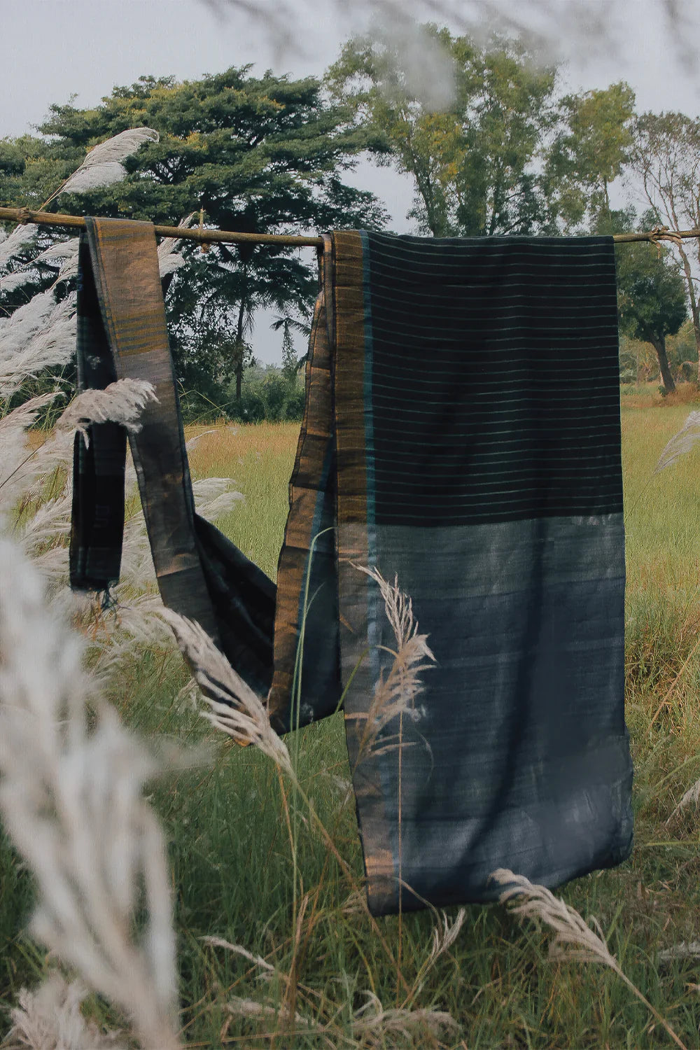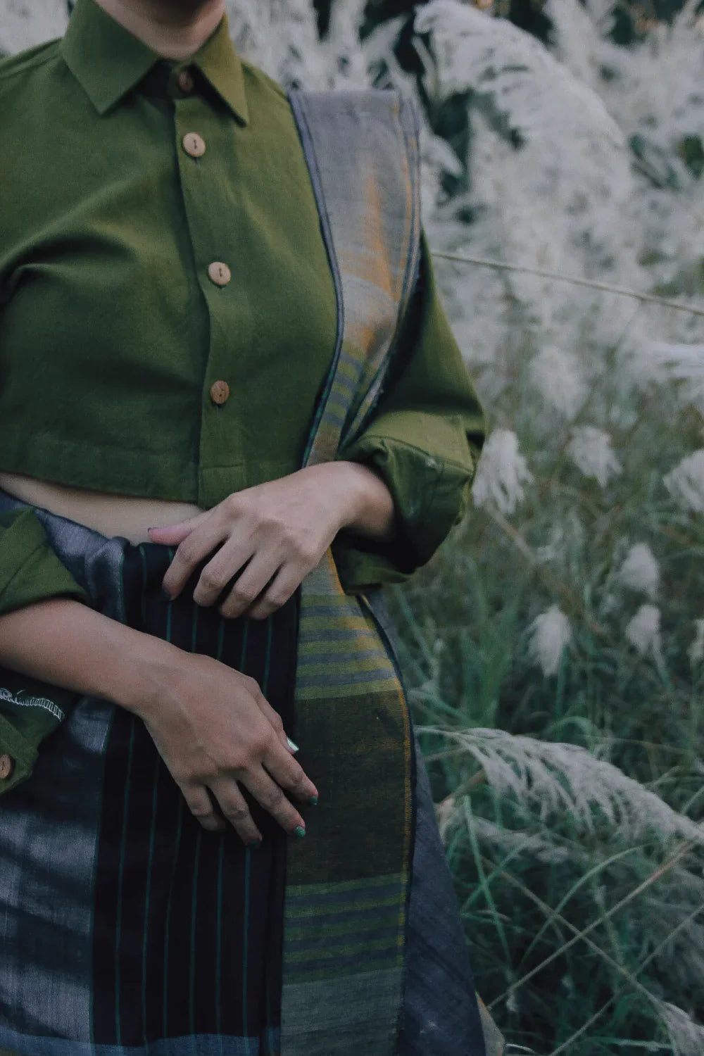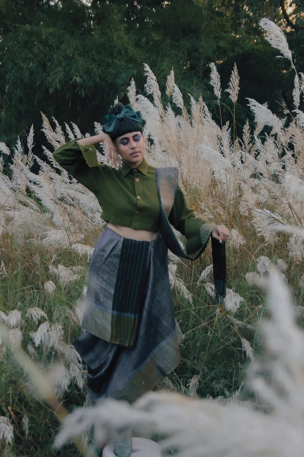 Revitalize your wardrobe with our Handloom Grey Kosa Silk Saree, a fusion of tradition and modernity. The broad Zari border and captivating Black & Green pallu exude timeless elegance. Drape it uniquely, mirroring the style in the picture, for a modern, avant-garde look. The luxurious grey Kosa silk adds a touch of sophistication, while the contemporary design reinvents the saree in a way never seen before. Embrace a distinctive fashion statement that seamlessly marries heritage and modern style. Elevate your ensemble to new heights with this captivating piece.