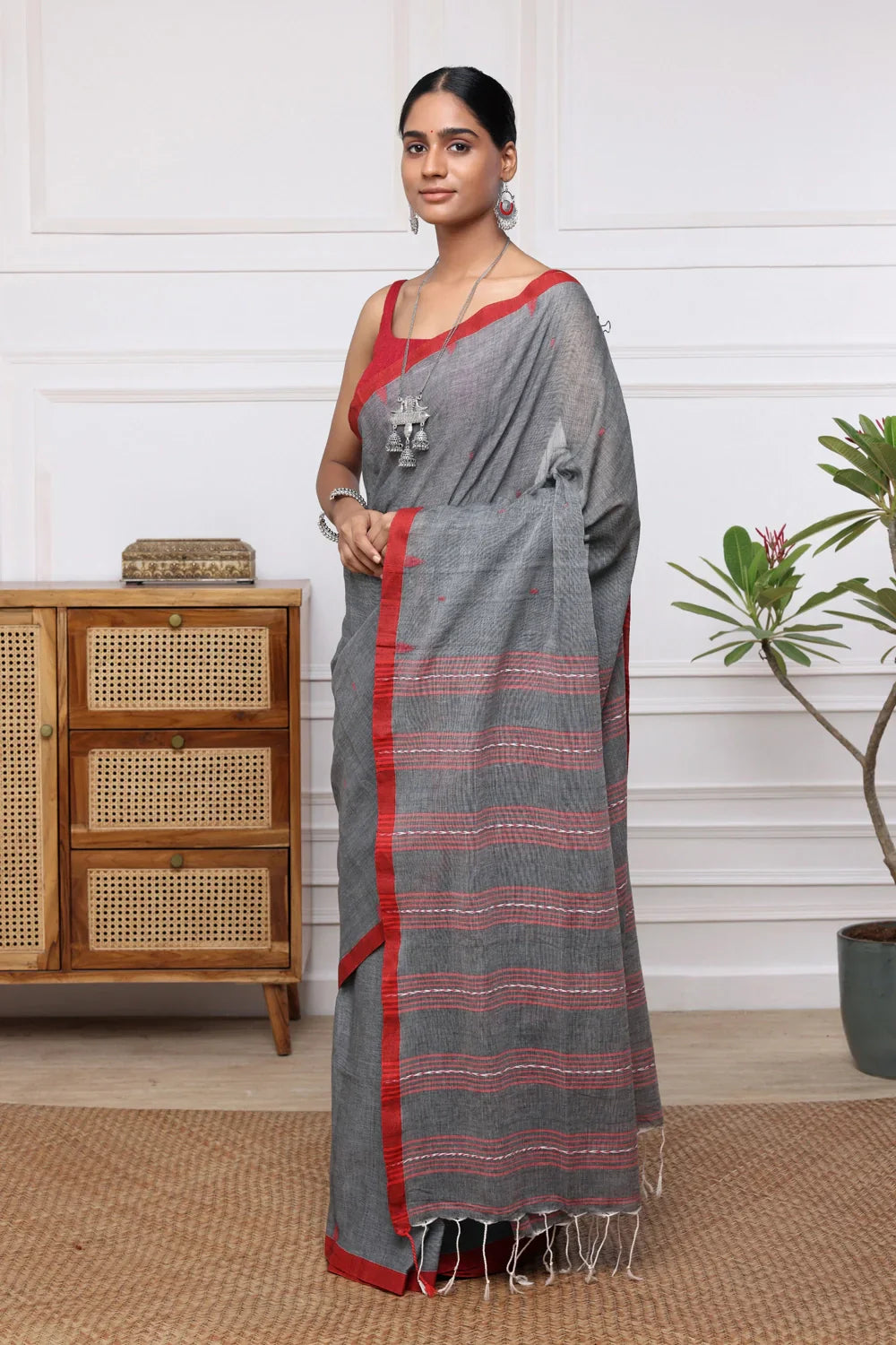 Handloom Grey Mul Cotton Jamdani Saree with Red Border