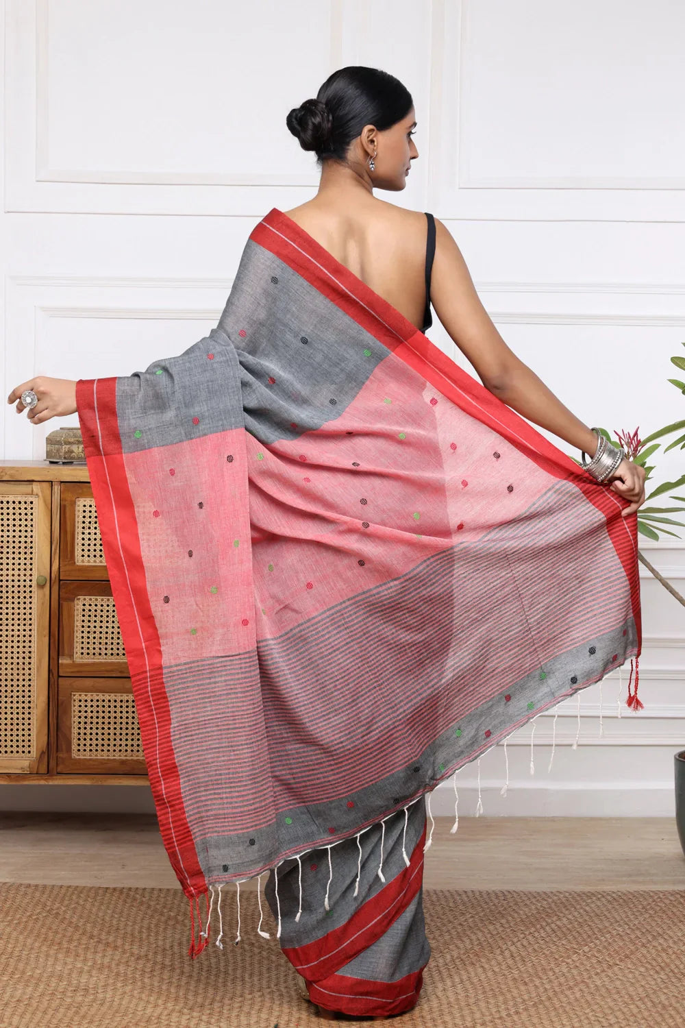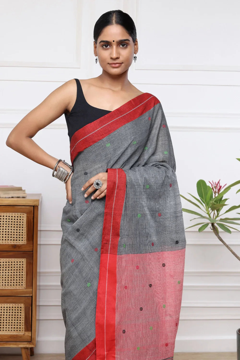 Handloom Grey Pure Cotton Jamdani Saree with Poka Dot Motifs