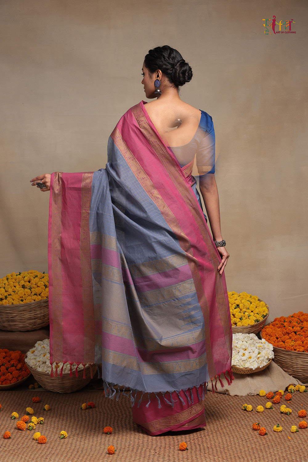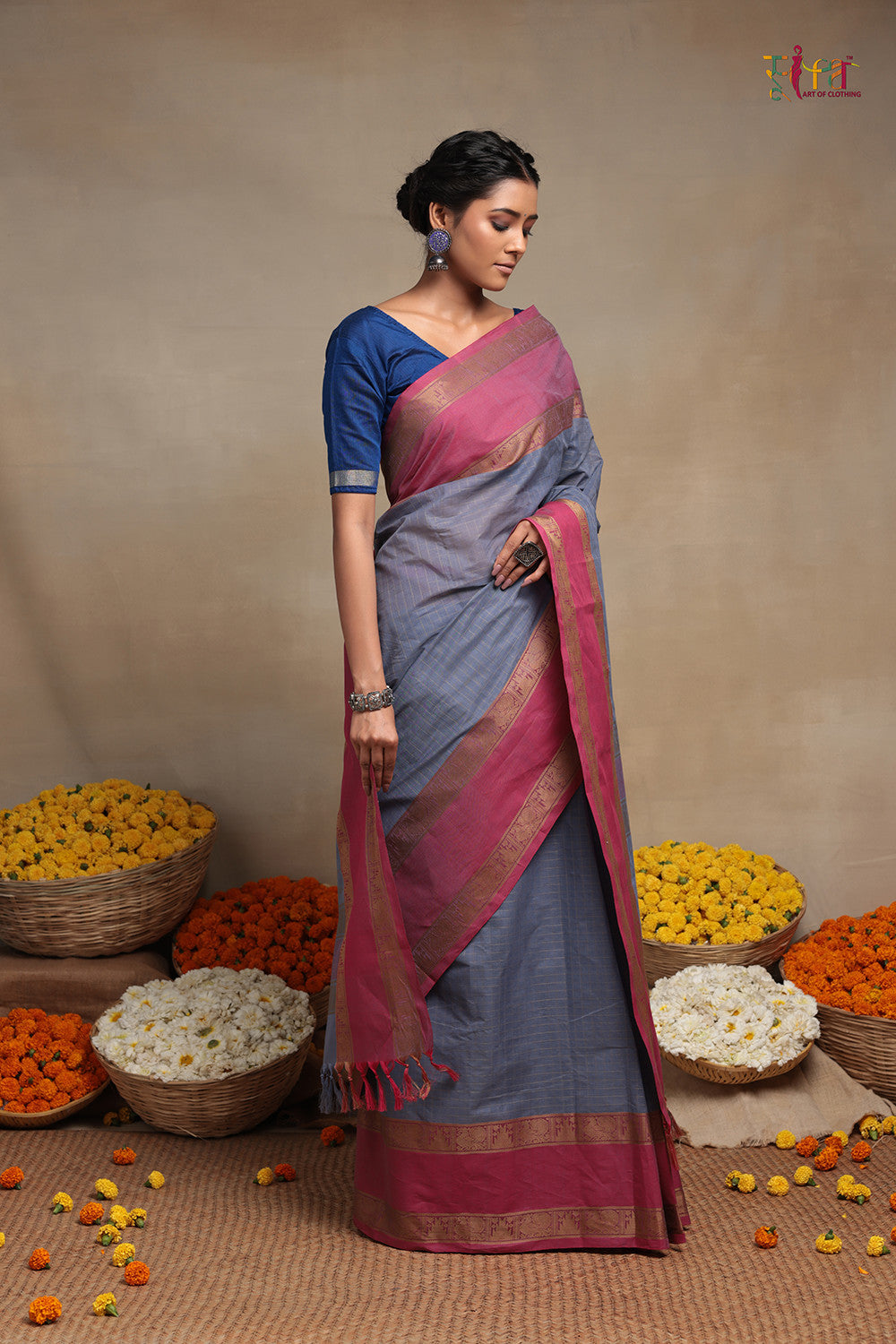 Handloom Grey Pure Cotton Kanchi Saree With Rouge Pink Border