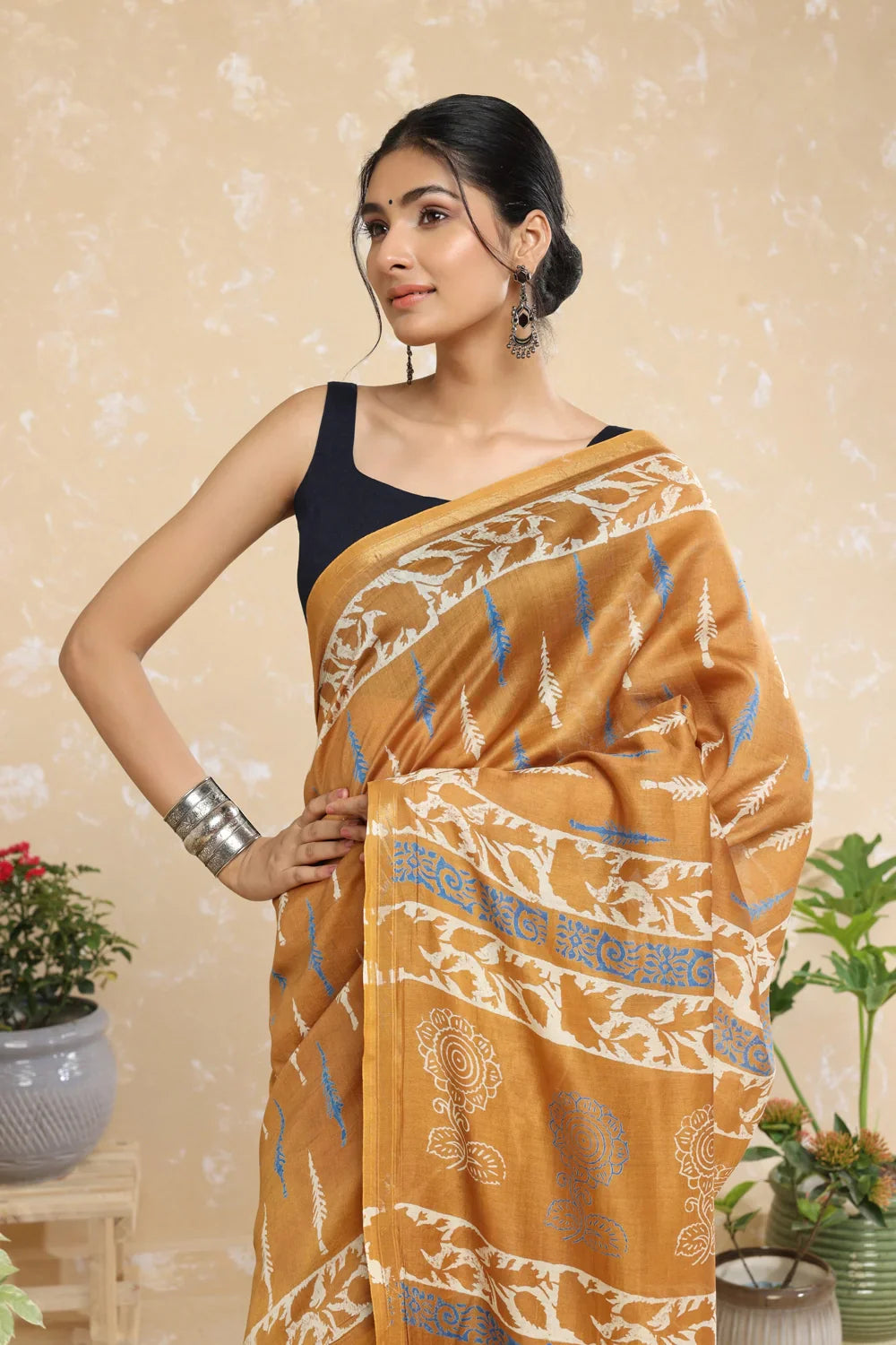 Handloom Honey Yellow Block Print Chanderi Cotton Saree