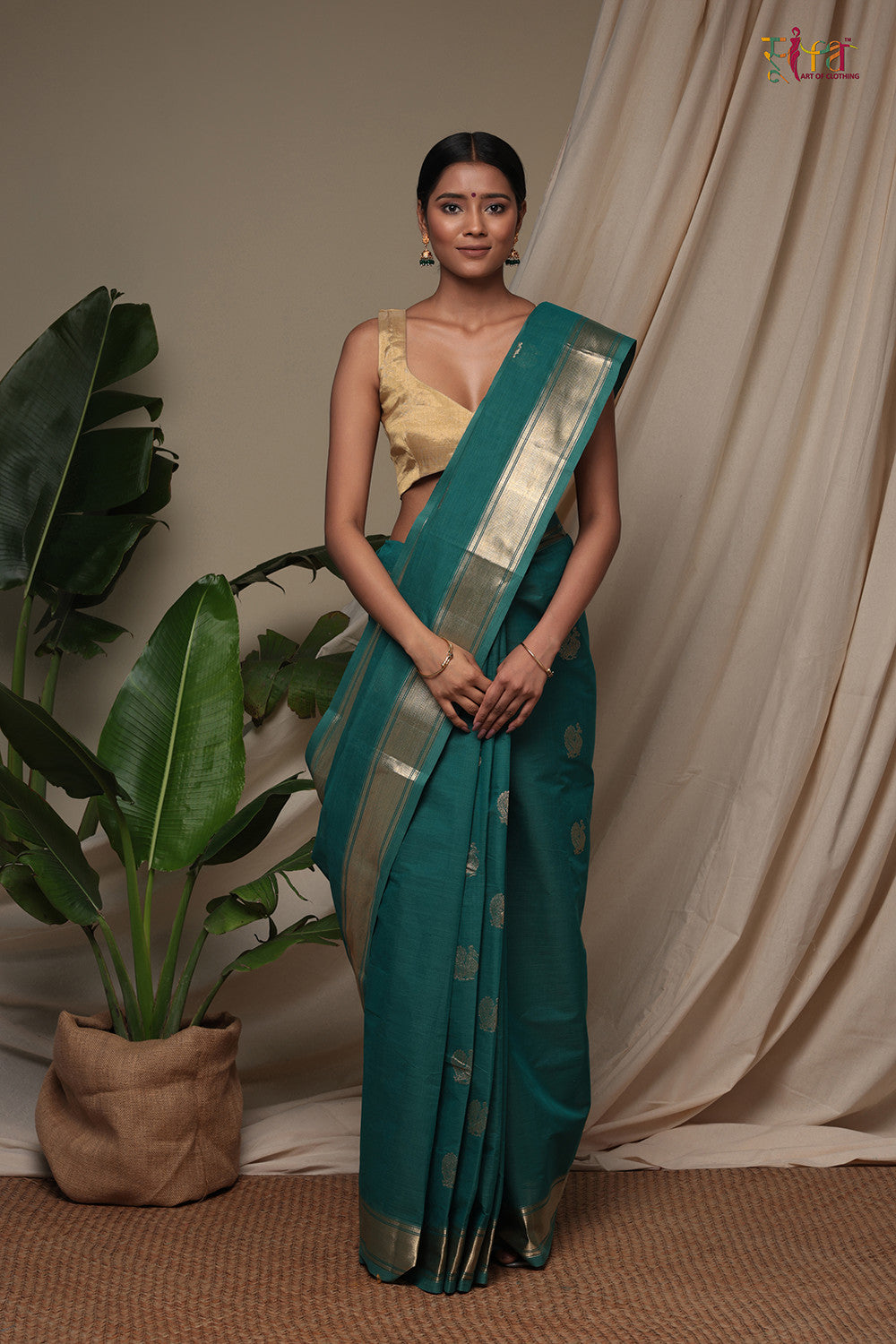 Upgrade your style with our Handloom Jade Green Pure Cotton Kanchi Saree, elevated by a beautiful Gold Zari Border and adorned with exquisite Kanchi Motifs. This saree is meticulously handcrafted, combining the opulence of Pure Cotton (Duo-Tone) with the artistry of Zari weaving, resulting in a stunning masterpiece. The perfect harmony between the Patels Green hue and the shimmering Gold Zari creates a captivating visual contrast. Delicately embellished with intricate motifs, expertly designed and crafted by skilled artisans, this saree exudes sophistication and charm.