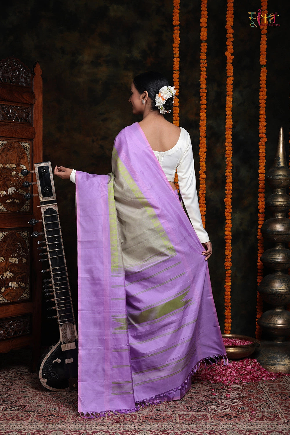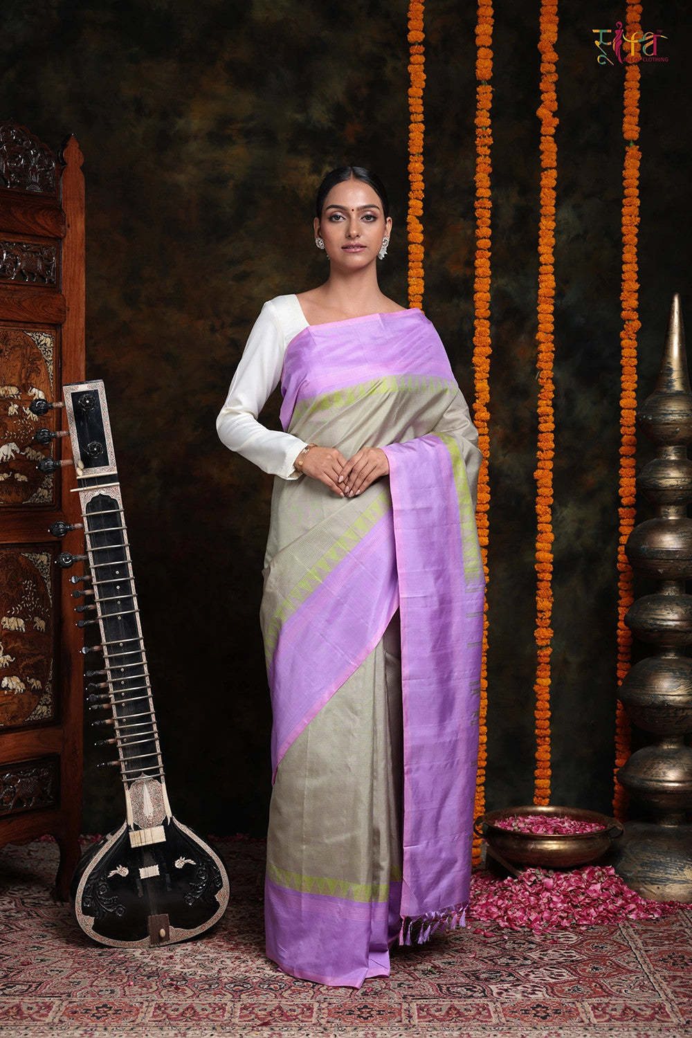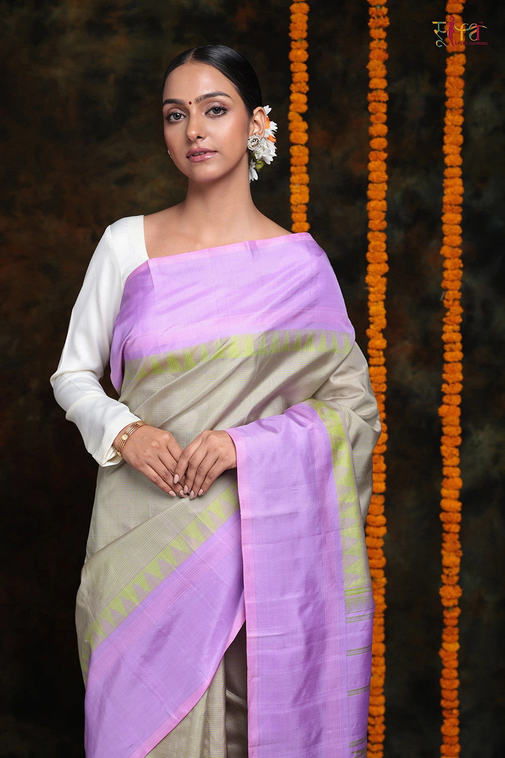 Step into a world of grace and opulence with this exquisite saree, a true embodiment of unique charm. The body of the saree is adorned with delicate checks that add a touch of elegance, while the striking statement borders and elaborate pallu elevate its beauty to new heights. Crafted from pure silk, this masterpiece exudes an aura of richness, class, and regality, making you feel like royalty.The captivating lime green pyramids steal the spotlight, enthralling everyone around you and ensuring that you stand out in a crowd. The combination of lime green and lavender is simply enchanting, adding a delightful touch to the overall appeal of this one-of-a-kind saree.