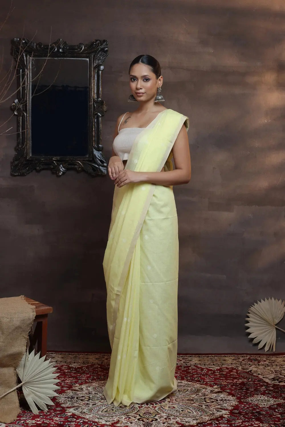 Experience the refreshing charm of our Handloom Lemon Soft Cotton Jamdani Saree, a perfect blend of white and lemon shades, ideal for summer. Adorned with intricate white woven motifs, this saree exudes elegance and versatility. Crafted with care, the soft cotton fabric ensures comfort for warm days. Elevate your look with jhumkas or a beautiful neckpiece, adding a touch of sophistication to your ensemble. Embrace the beauty of this saree and make a stylish statement in the summer heat with its delightful colors and timeless appeal.
