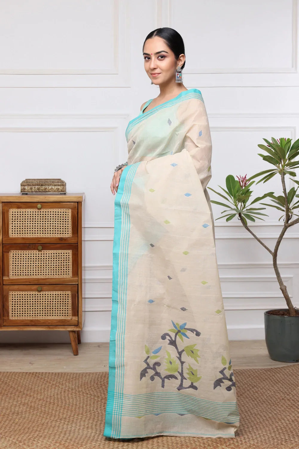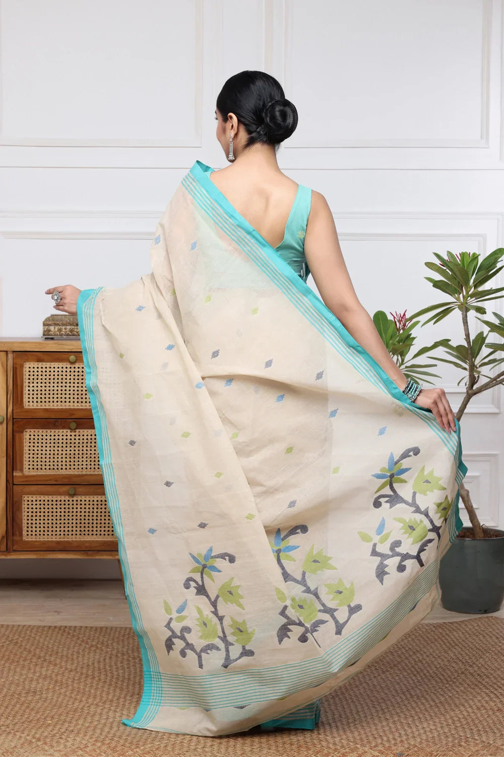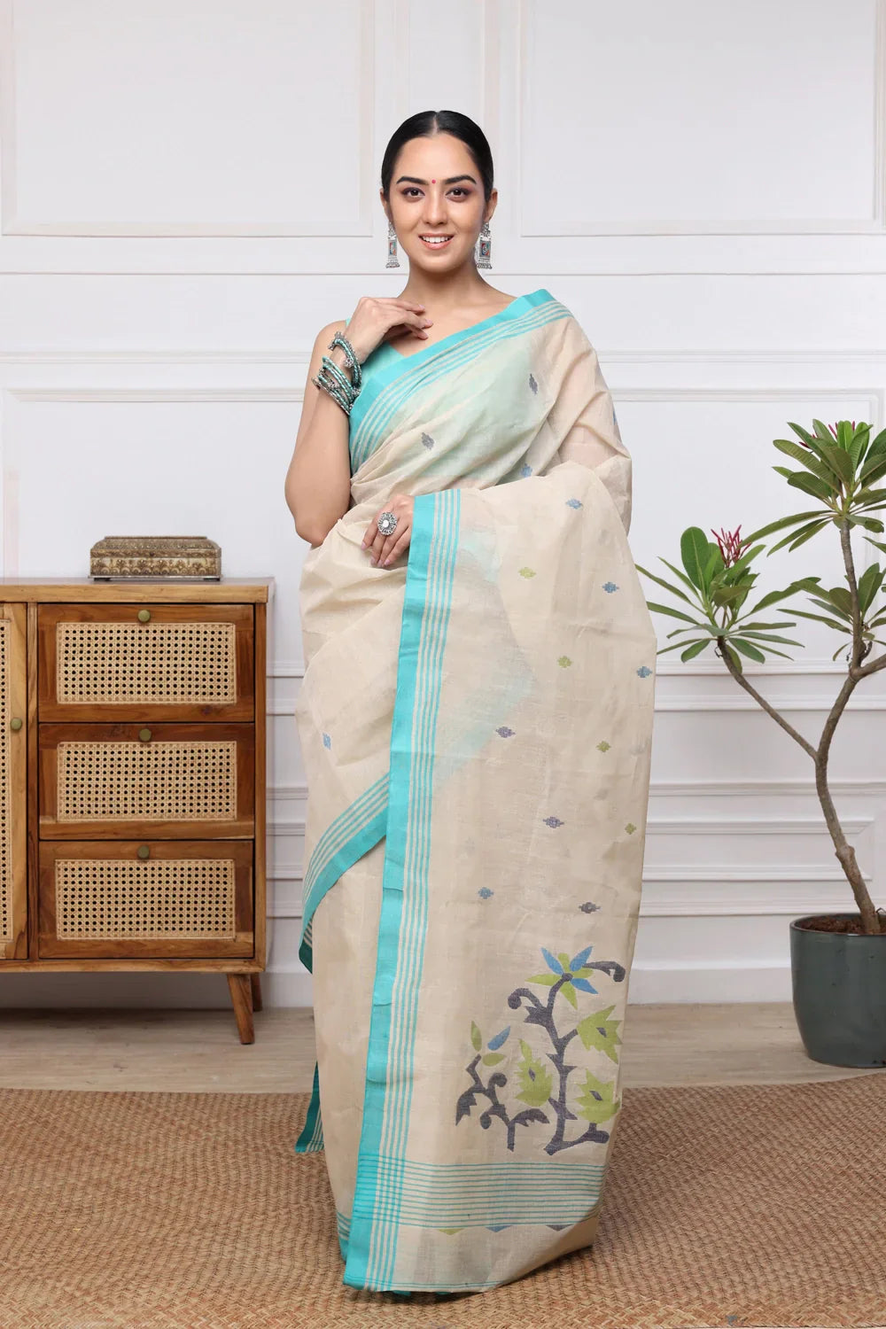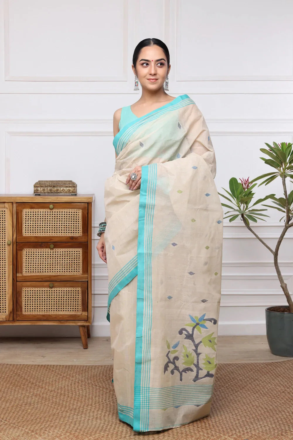 Handloom Light Brown Pure Cotton Multi Colour Floral Jamdani Saree