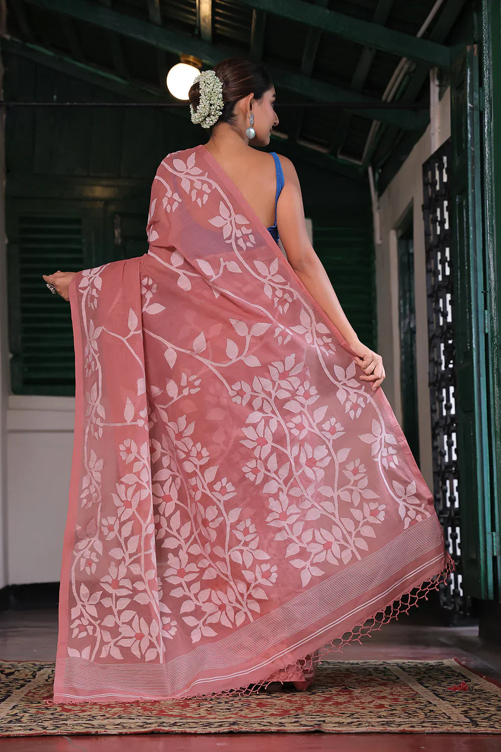 Handloom Mulberry Pink Pure Cotton Jamdani Saree with Floral Motifs