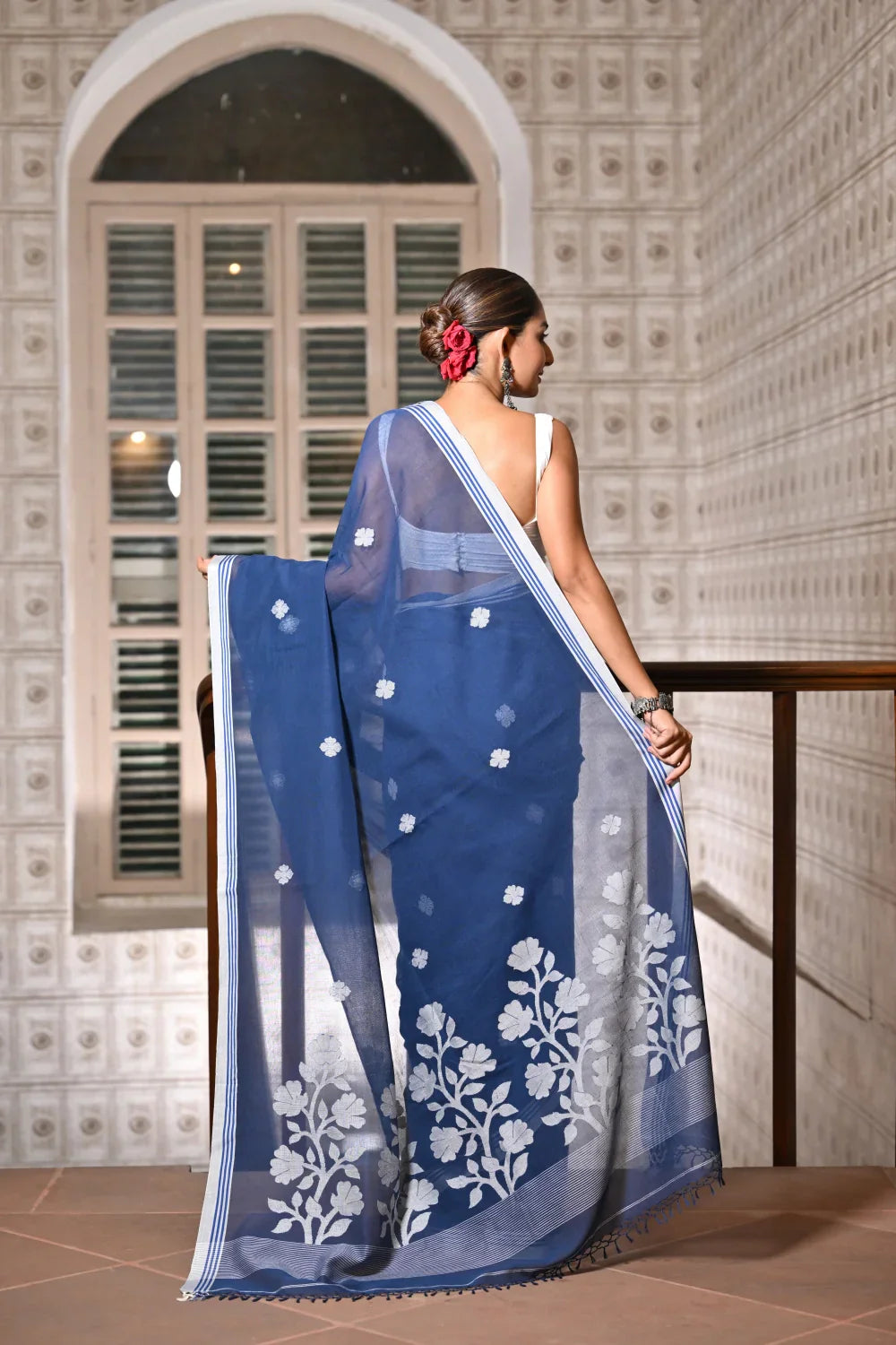 Handloom Navy Blue Contemporary Jamdani with Floral Motifs Saree