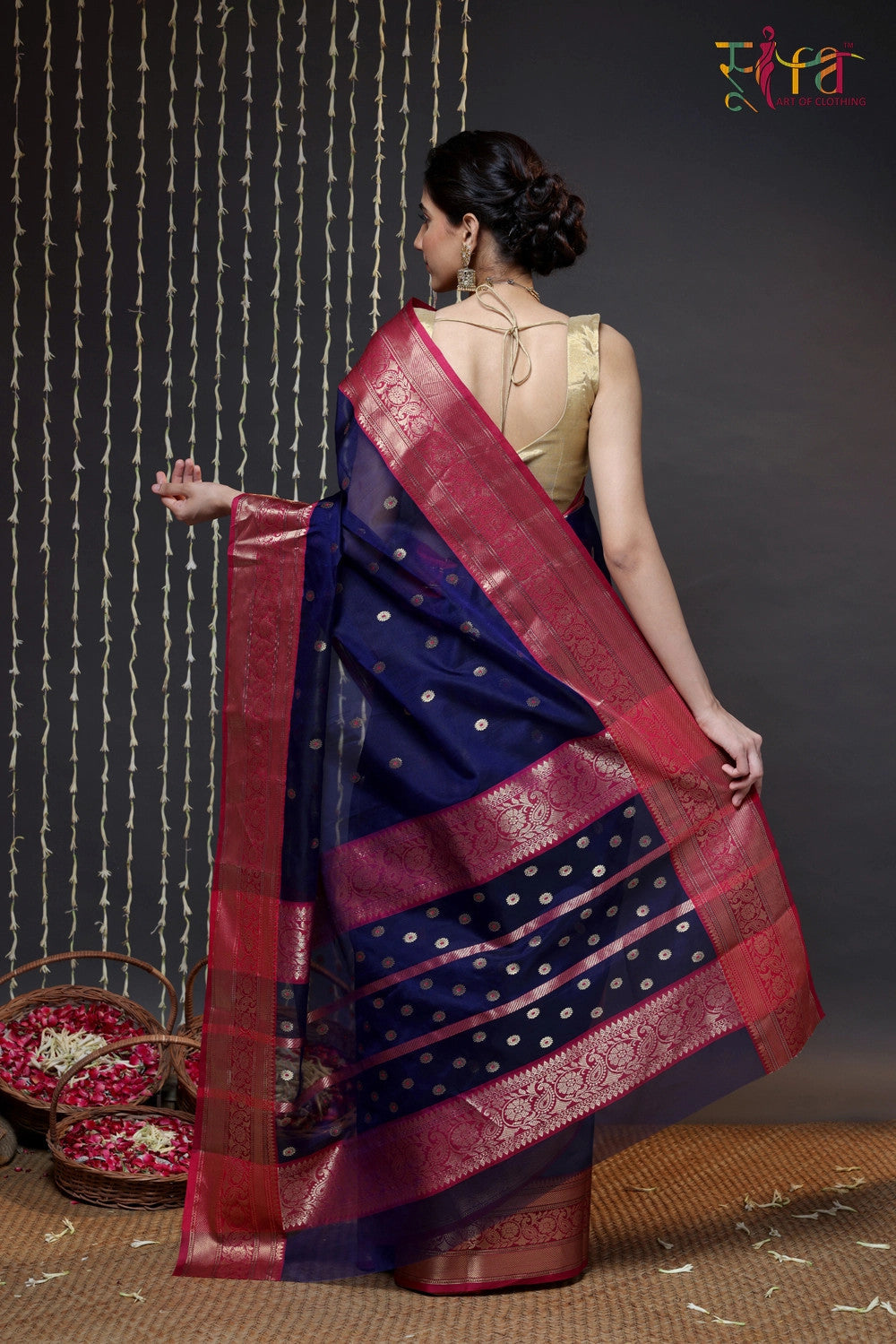 Handloom Navy Blue Katan Silk Chanderi Saree