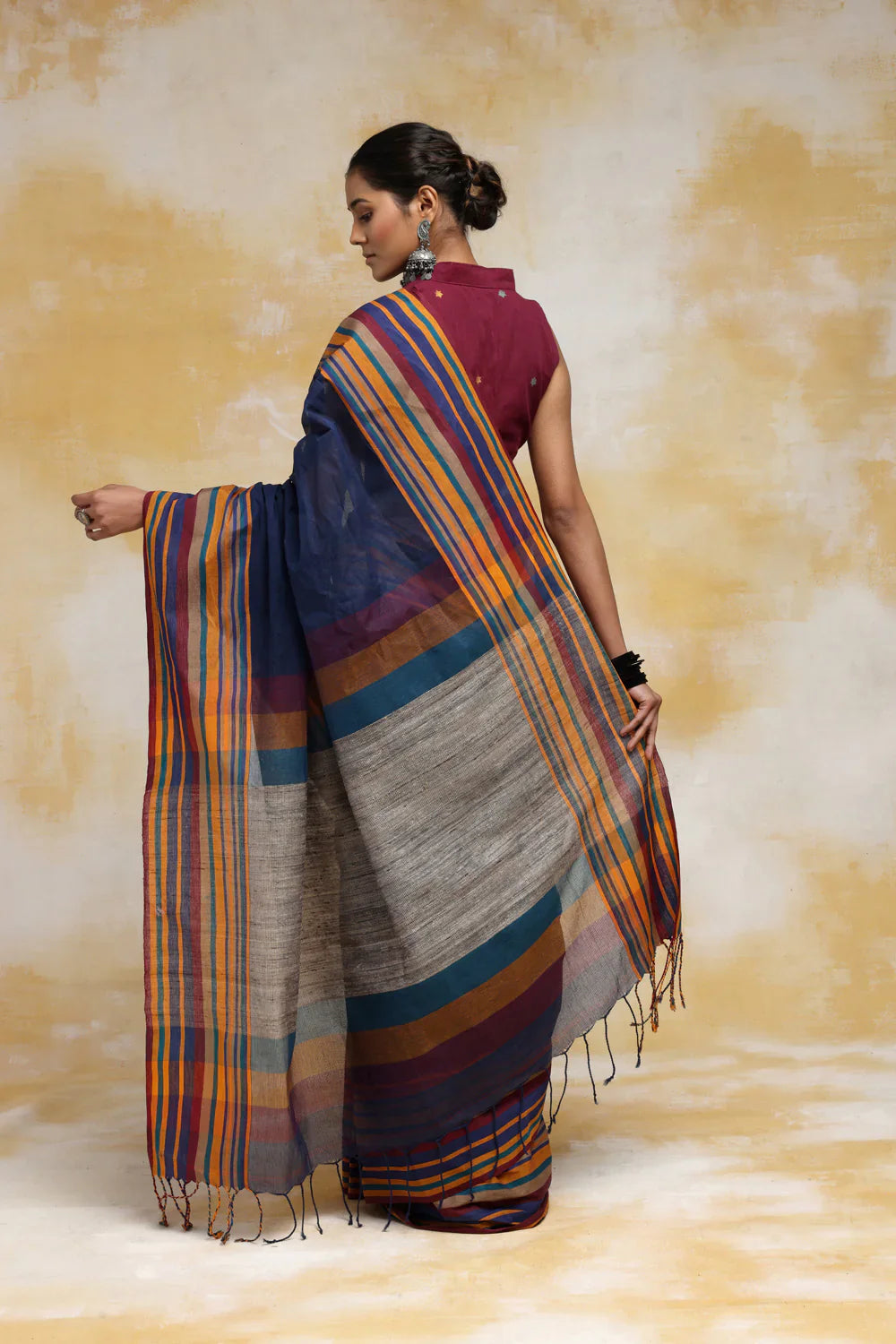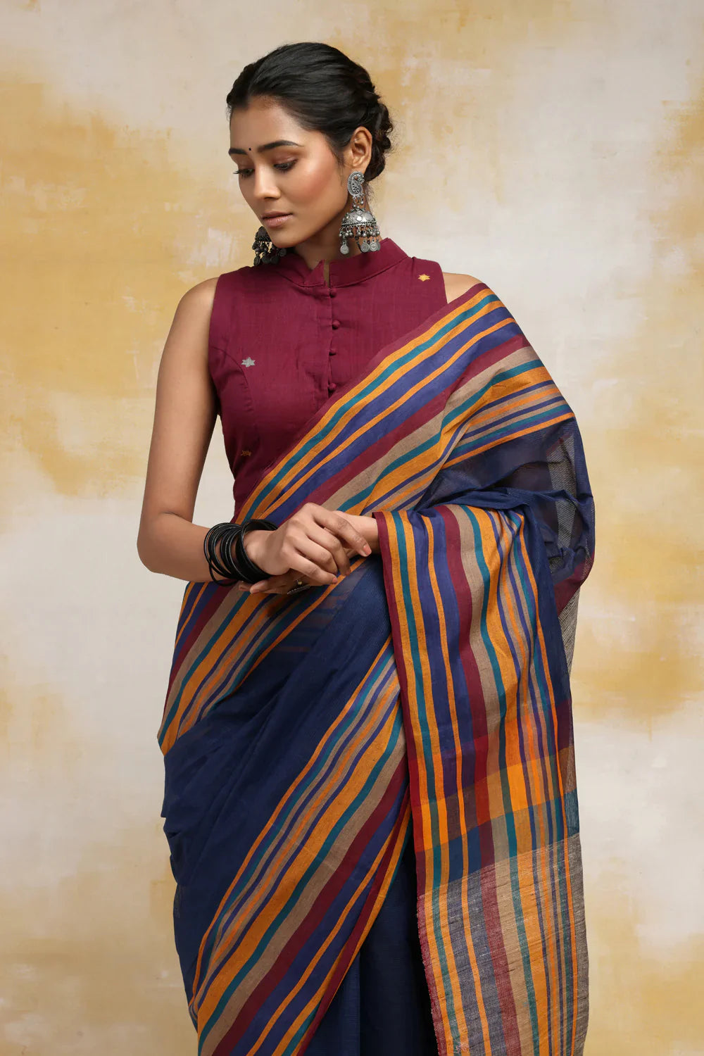 Handloom Navy Blue Pure Cotton Saree With Multi Colour Border