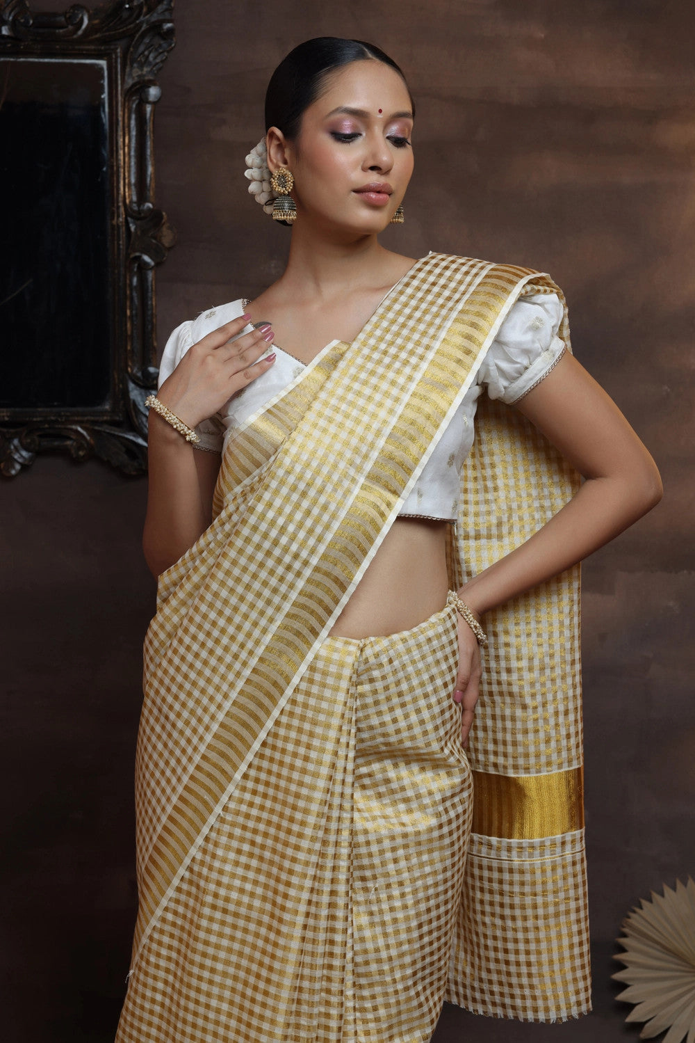 Handloom Off White Pure Cotton Kasavu Saree With All Over Gold Zari Checks