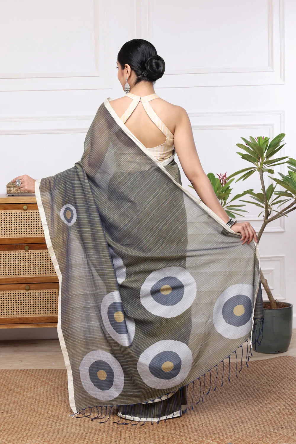 This exquisite saree features an elegant olive green base adorned with intricate Jamdani eyeball motifs and subtle stripes. Handwoven from soft mul cotton, it drapes gracefully, offering both comfort and style. Perfect for any occasion, its unique design reflects the rich tradition of Jamdani weaving. Elevate your wardrobe with this timeless piece that blends heritage craftsmanship with contemporary elegance.