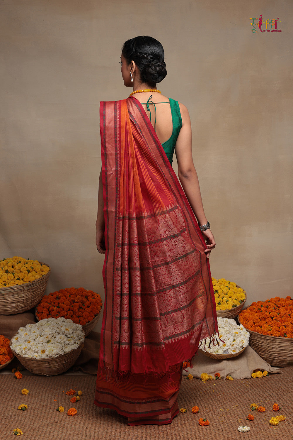 Handloom Orange & Red Pure Cotton Kanchi Saree