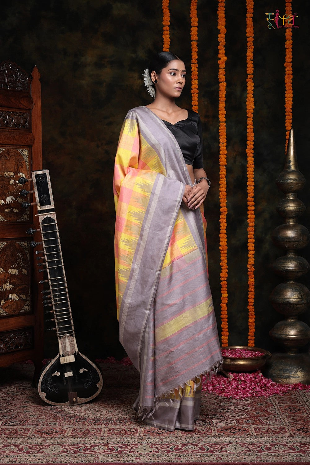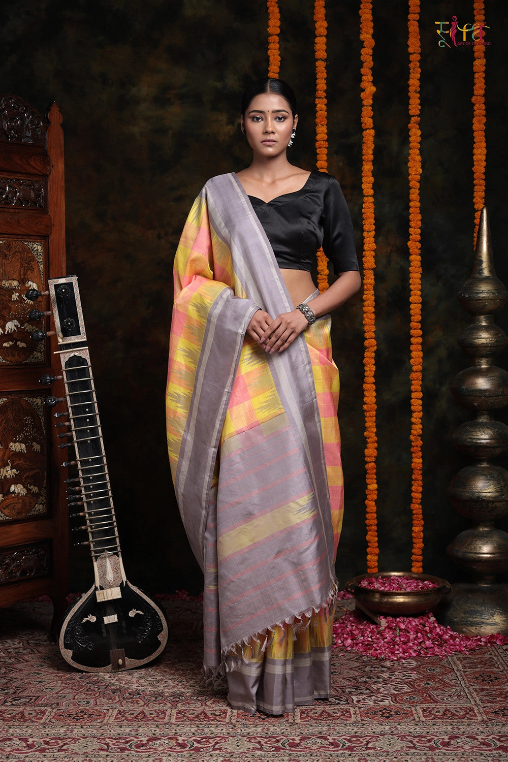 Handloom Peach & Lemon Check Design Saree With Grey Border