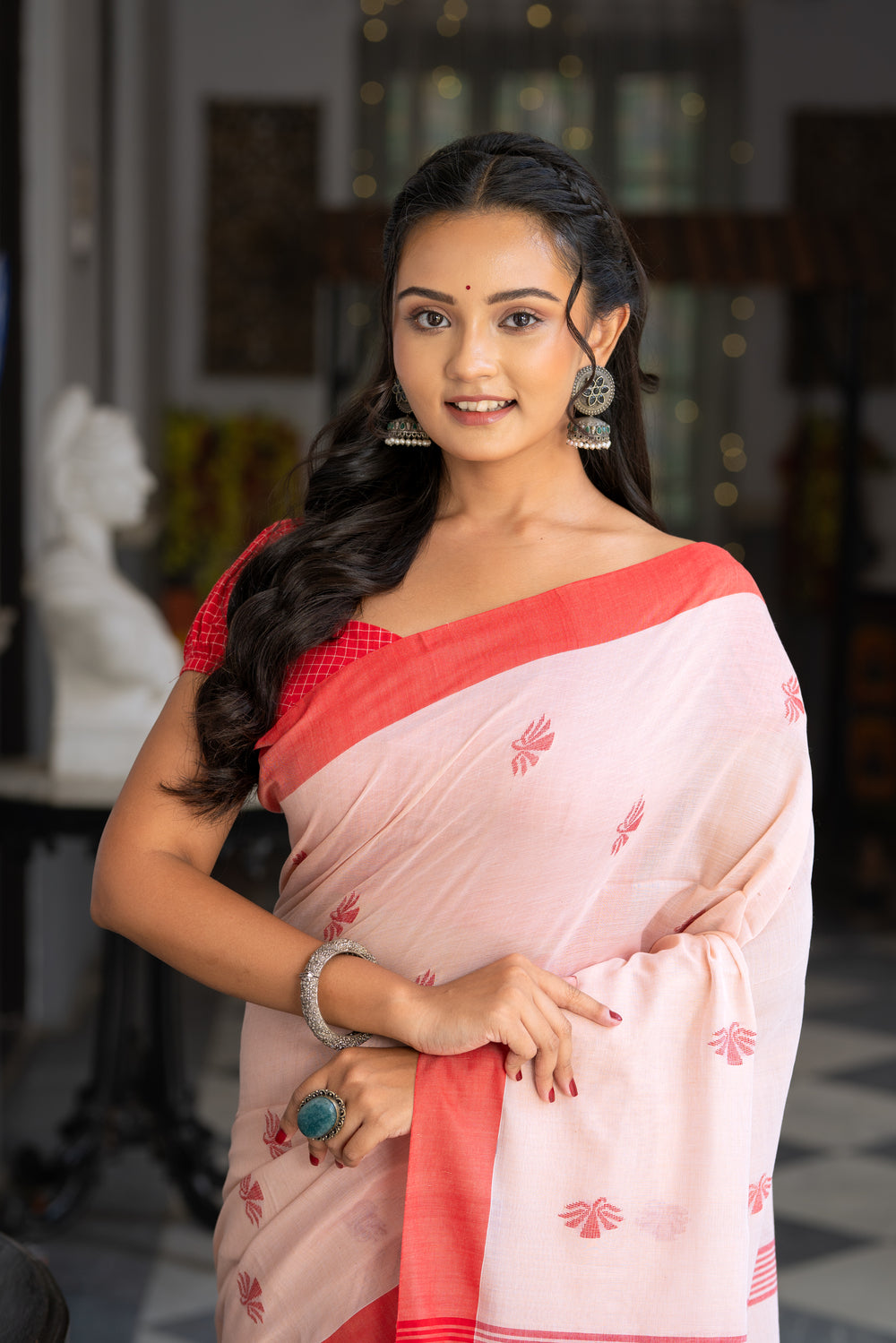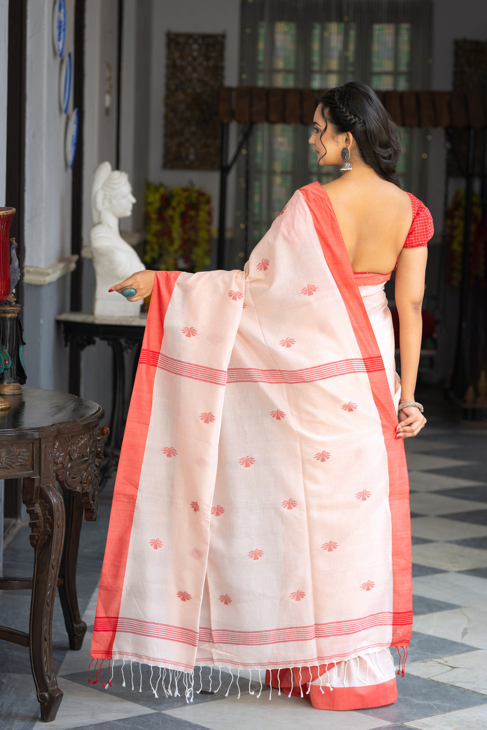 Handloom Peach & Red Mul Cotton Jamdani Saree
