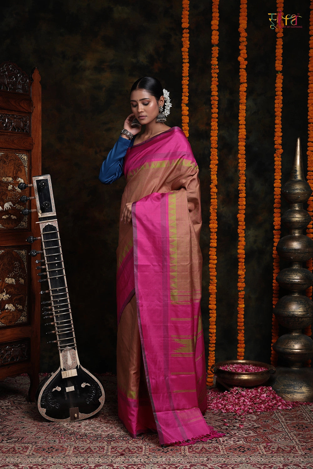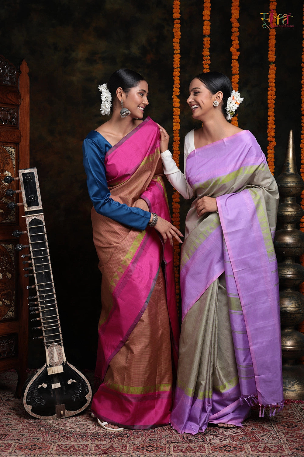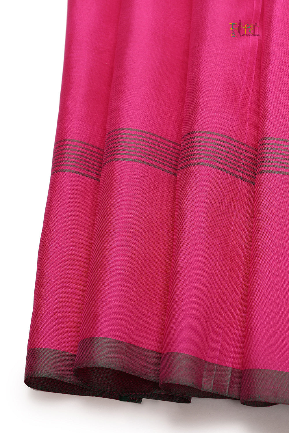 Step into a world of grace and opulence with this exquisite saree, a true embodiment of unique charm. The body of the saree is adorned with delicate checks that add a touch of elegance, while the striking statement borders and elaborate pallu elevate its beauty to new heights. Crafted from pure silk, this masterpiece exudes an aura of richness, class, and regality, making you feel like royalty.The captivating lime green pyramids steal the spotlight, enthralling everyone around you and ensuring that you stand out in a crowd. The combination of lime green and Pink is simply enchanting, adding a delightful touch to the overall appeal of this one-of-a-kind saree.