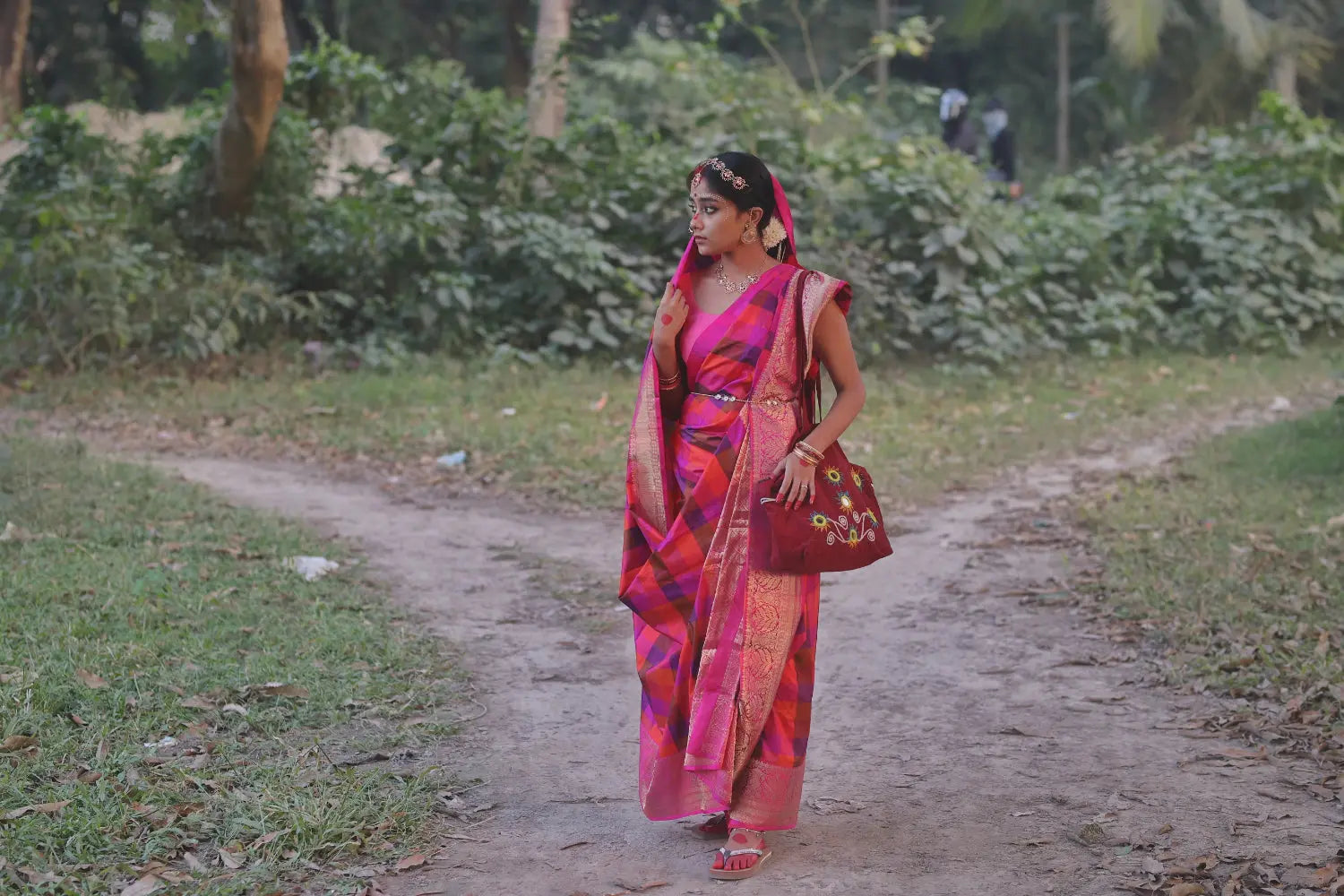 Indulge in the allure of our Handloom Multi-color Box Checks Pure Silk Banarasi Saree. The exquisite craftsmanship reveals a harmonious blend of vibrant hues, accentuated by a striking hot pink Gold Zari border. Perfect for weddings and festive celebrations, this saree seamlessly merges traditional charm with contemporary style. Immerse yourself in the luxurious feel of pure silk, making a timeless and graceful statement on special occasions. Elevate your ethnic wardrobe with this artistic creation, embodying the essence of elegance and tradition in every weave.