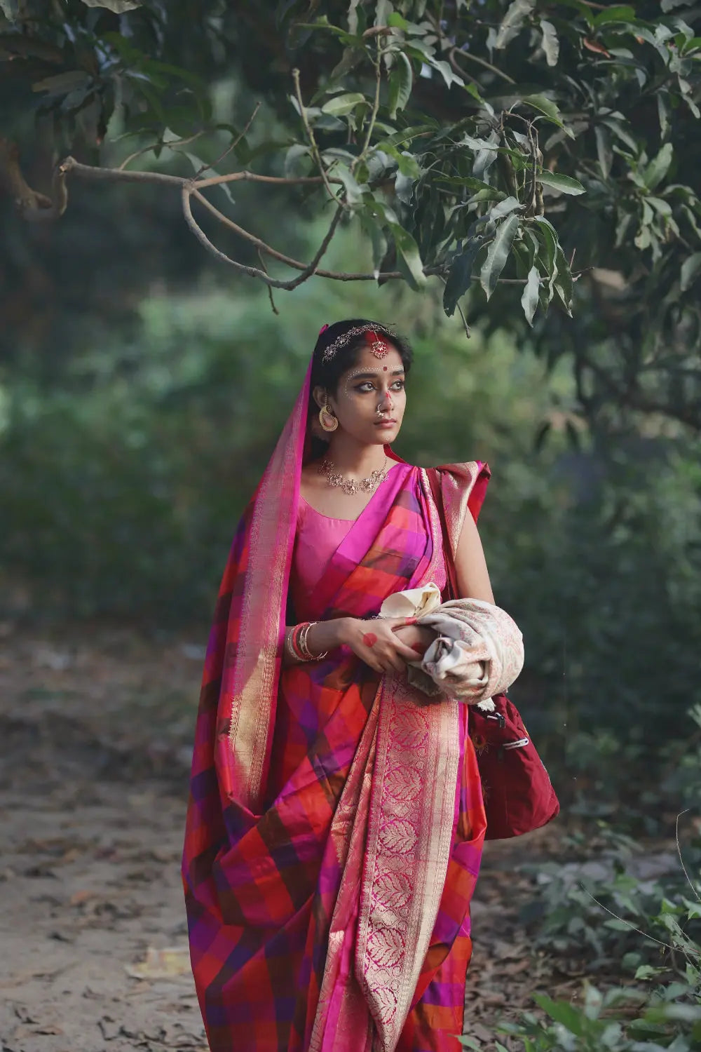 Handloom Pink Multi Colour Box Checks Pure Silk Banarasi Saree With Hot Pink Gold Zari Border