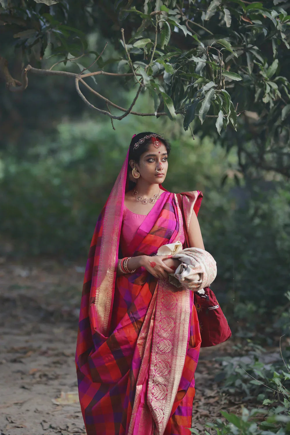 Indulge in the allure of our Handloom Multi-color Box Checks Pure Silk Banarasi Saree. The exquisite craftsmanship reveals a harmonious blend of vibrant hues, accentuated by a striking hot pink Gold Zari border. Perfect for weddings and festive celebrations, this saree seamlessly merges traditional charm with contemporary style. Immerse yourself in the luxurious feel of pure silk, making a timeless and graceful statement on special occasions. Elevate your ethnic wardrobe with this artistic creation, embodying the essence of elegance and tradition in every weave.