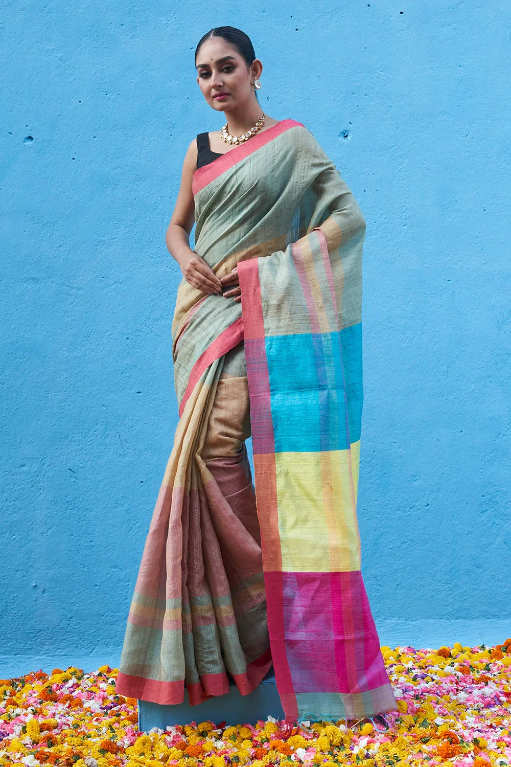 Handloom Pink Multi-Colour Pure Tussar Silk Saree, featuring a captivating multi-colour pallu and an elegant pink border. Crafted with precision and care, this saree epitomizes the charm and luxury of Tussar silk. Adorned with vibrant hues against a soft pink backdrop, it exudes timeless beauty and sophistication. Perfect for special occasions, this saree effortlessly blends tradition with modern elegance. Elevate your ensemble with this exquisite piece, showcasing the craftsmanship and allure of handloom textiles. Make a statement with every graceful drape in this stunning saree, a true embodiment of grace and style.