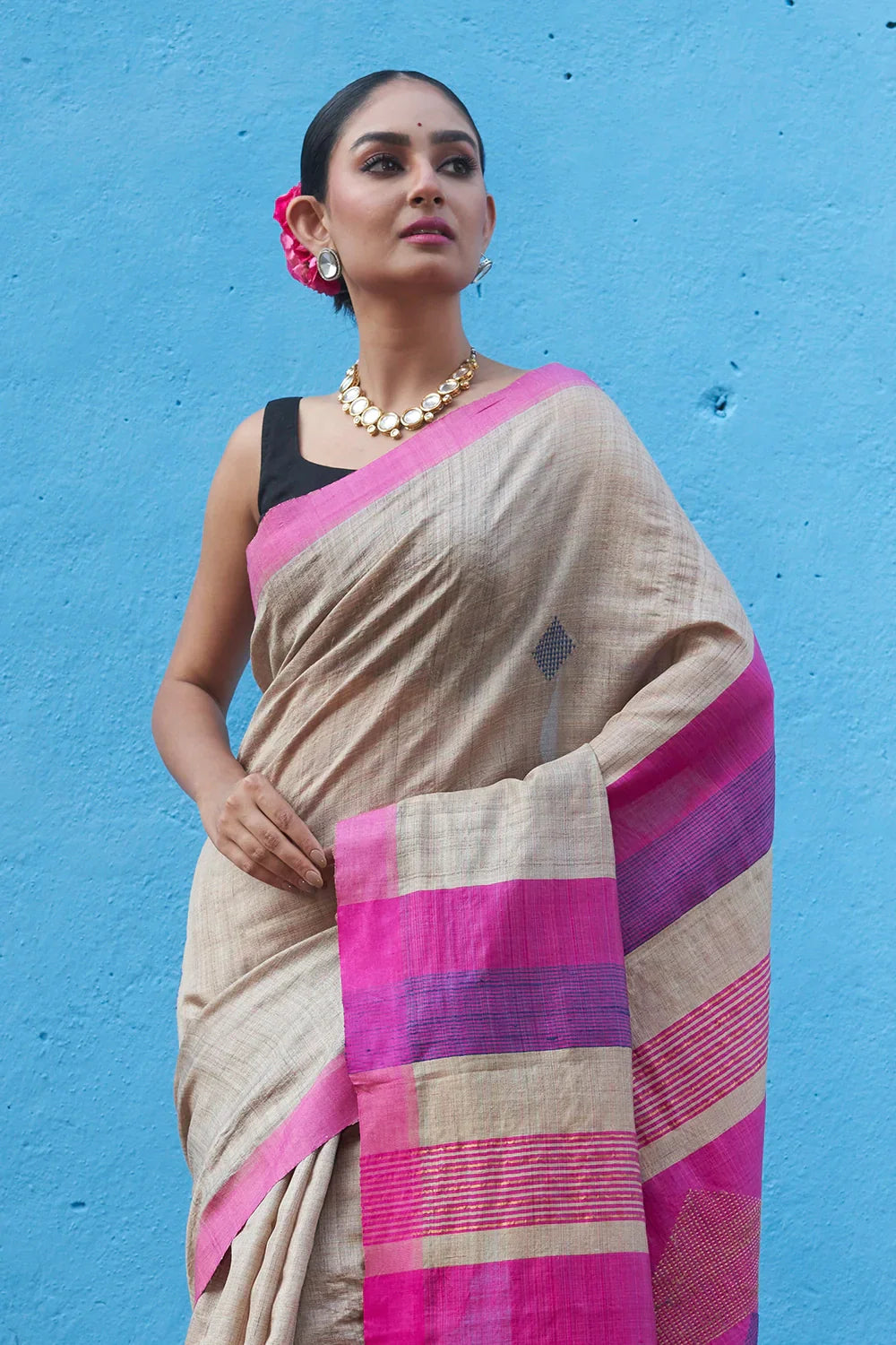 Handloom Pink Multi Colour Pure Tussar Silk Saree