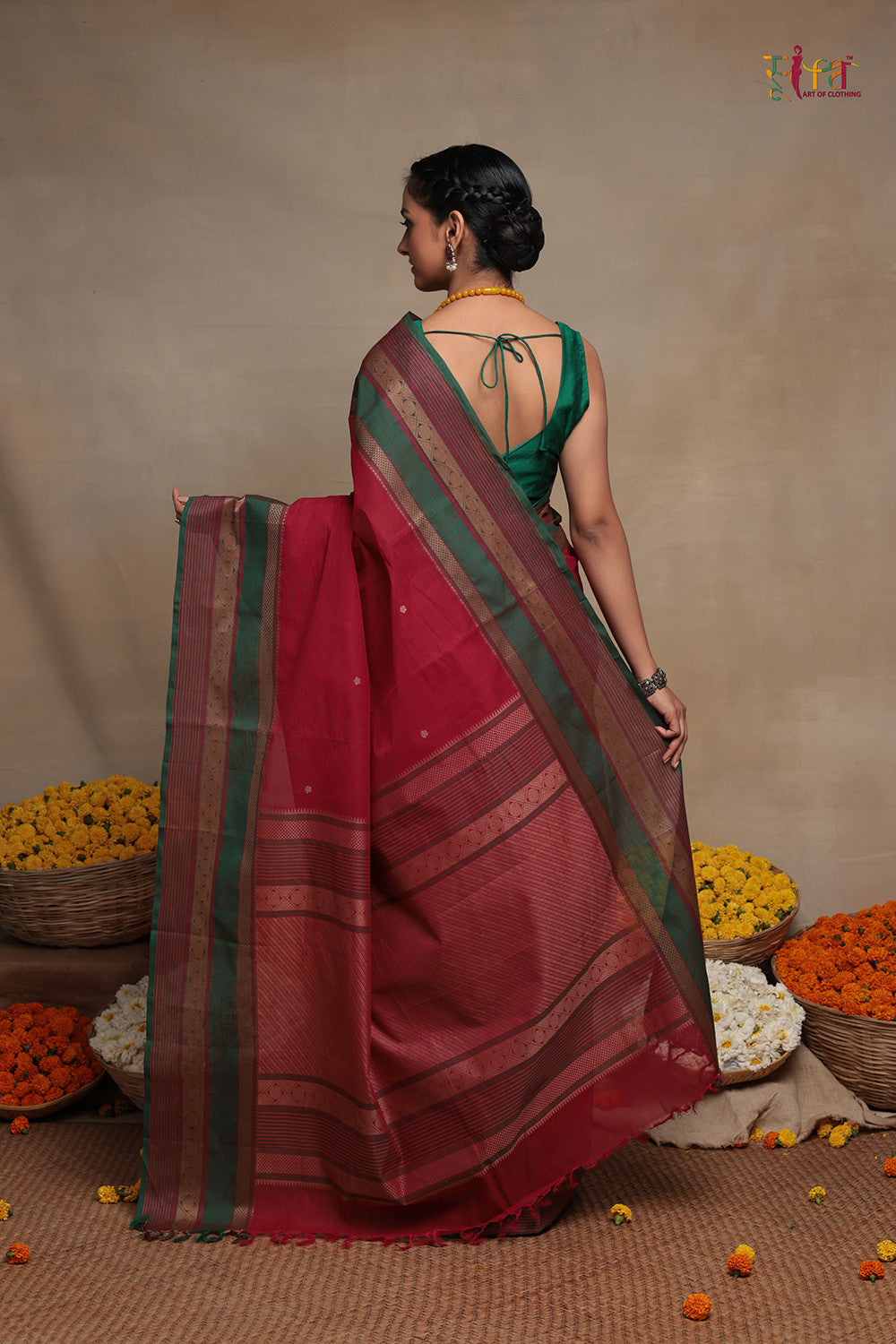 Immerse yourself in the meticulous craftsmanship that brings this saree to life, showcasing a vibrant blend of Magenta and Green shades that exude an aura of sheer elegance.Crafted from the finest pure Cotton fabric, this saree not only envelops you in comfort but also adds a touch of refinement to your ensemble. Each stitch tells a tale of tradition, with delicate beige flower bootis embellishing its surface, creating a mesmerizing visual spectacle.This saree effortlessly transitions between occasions, be it a joyful festive celebration or an elegant formal gathering.