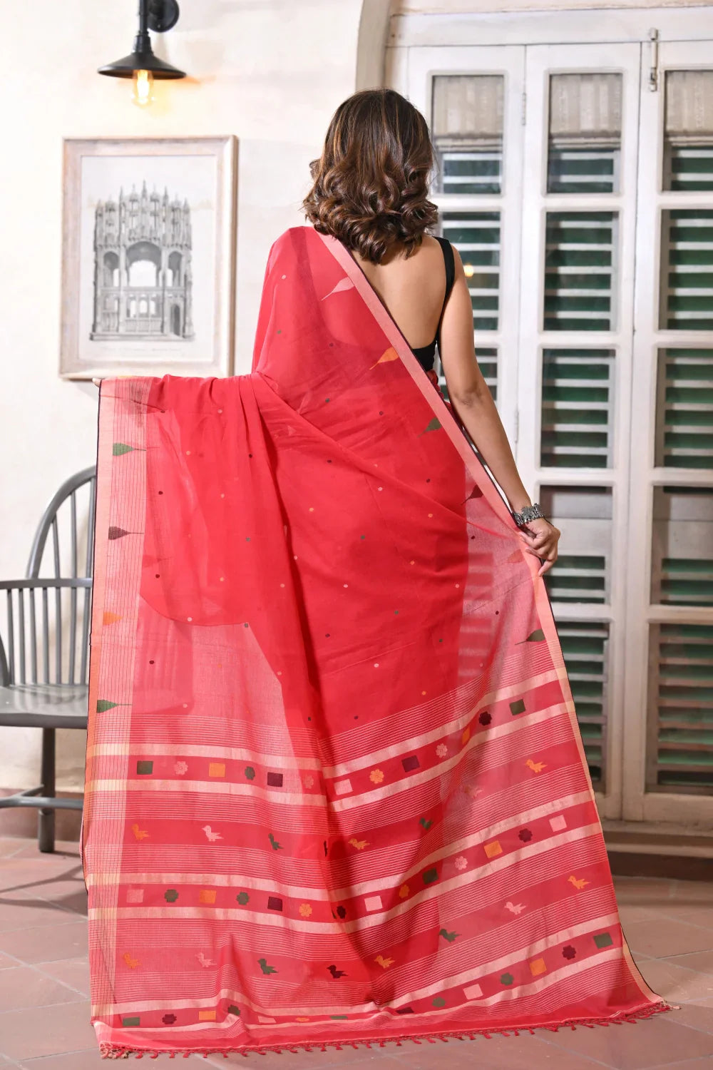 Handloom Red Soft Cotton Jamdani Saree Woven Bird Motifs In Pallu