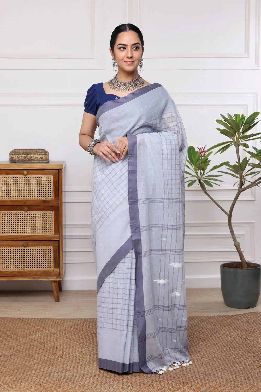 Elevate your ensemble with our Handloom Sky Blue Check Pure Cotton Jamdani Saree adorned with a navy blue border. Meticulously woven with traditional Jamdani motifs, this saree blends classic craftsmanship with contemporary elegance. Crafted from pure cotton, it offers a lightweight feel and graceful drape, ideal for all-day comfort. Embrace the timeless allure of handloom artistry with this exquisite piece.