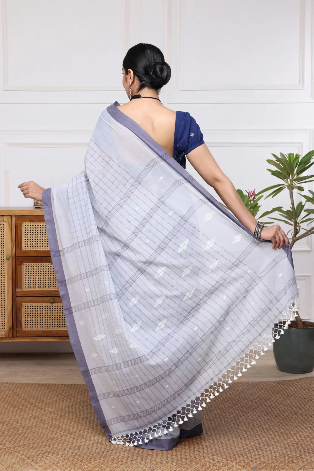 Handloom Sky Blue Check Pure Cotton Jamdani Saree