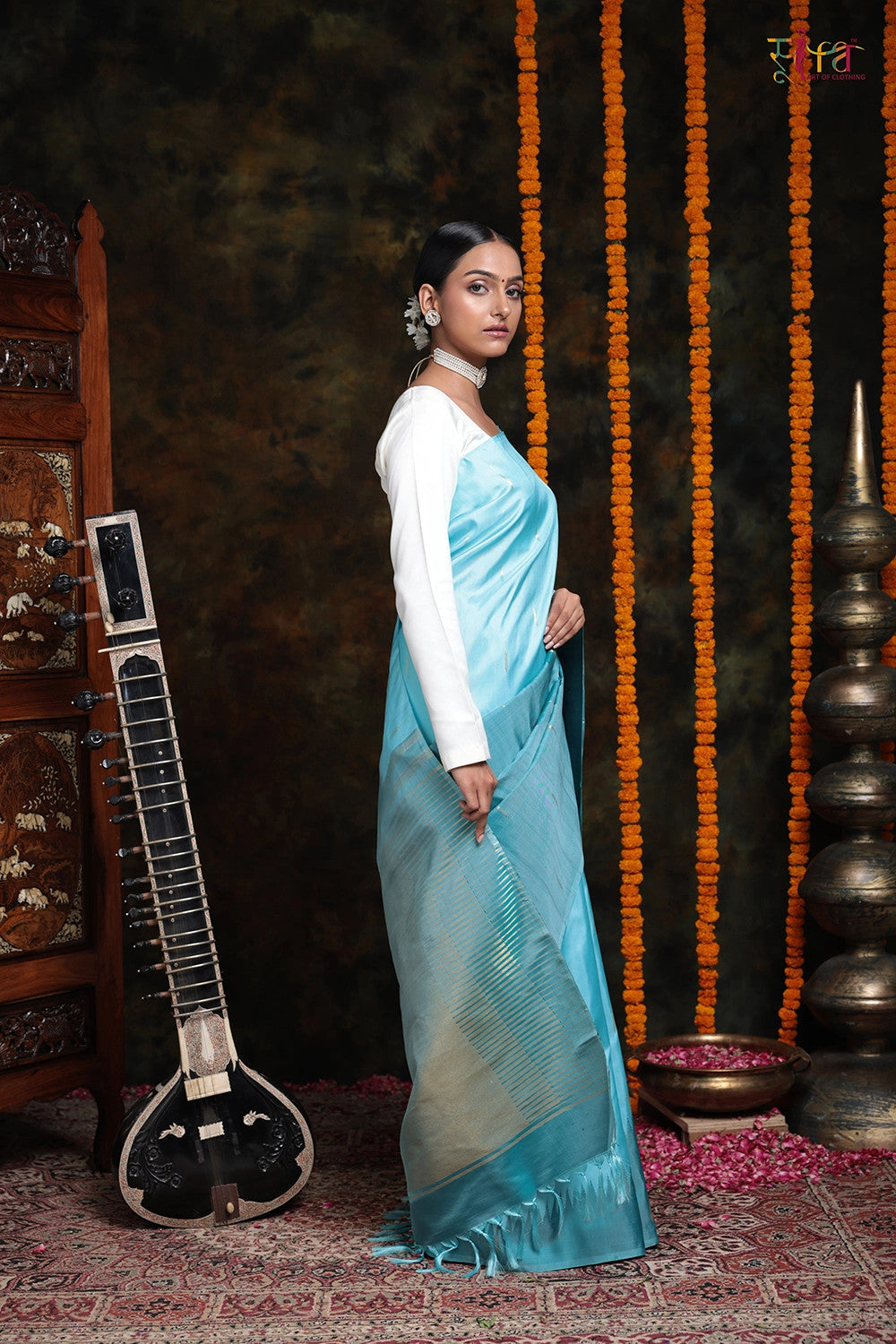 Handloom Sky Blue Low Rise Temple Design Pure Silk Kanchipattu