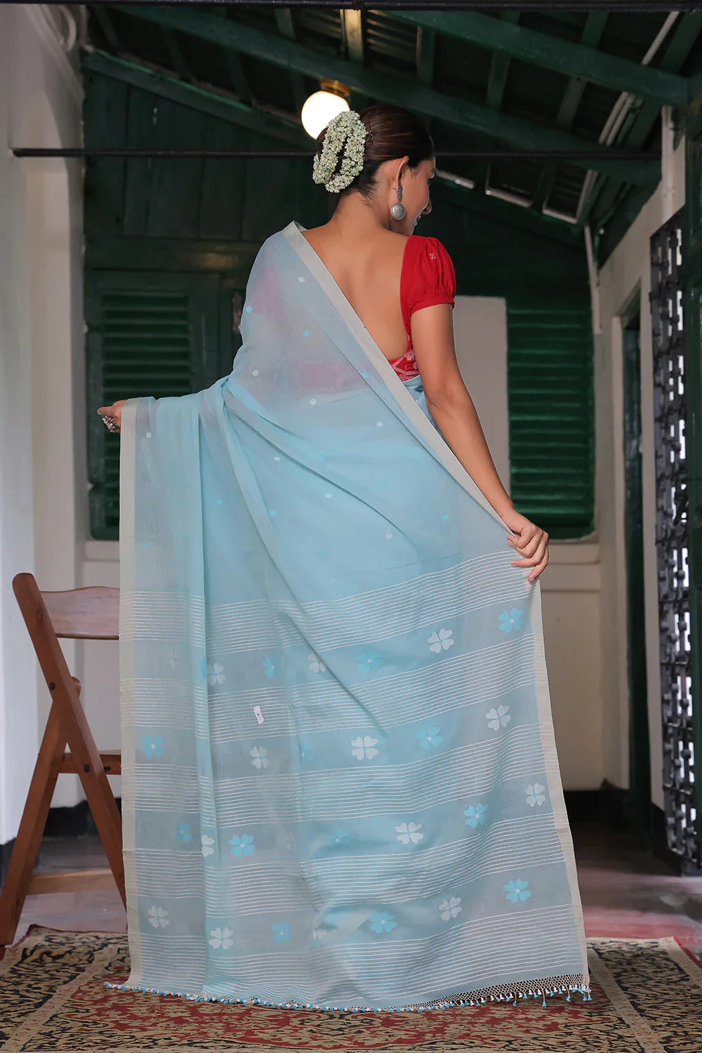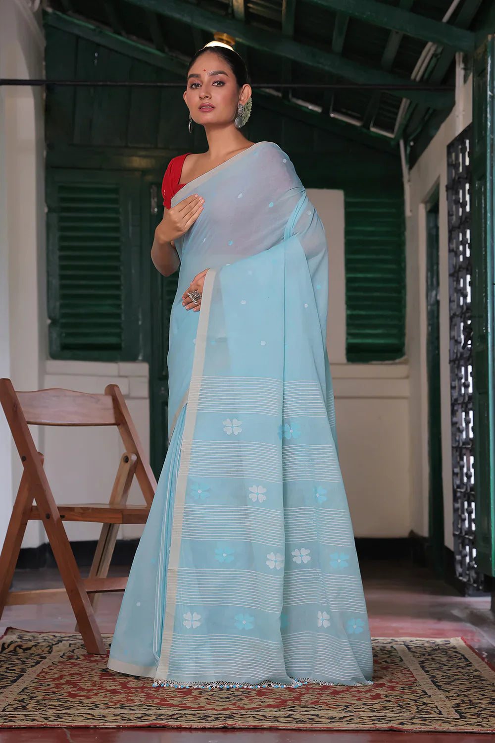 Handloom Sky Blue Soft Cotton Jamdani Saree