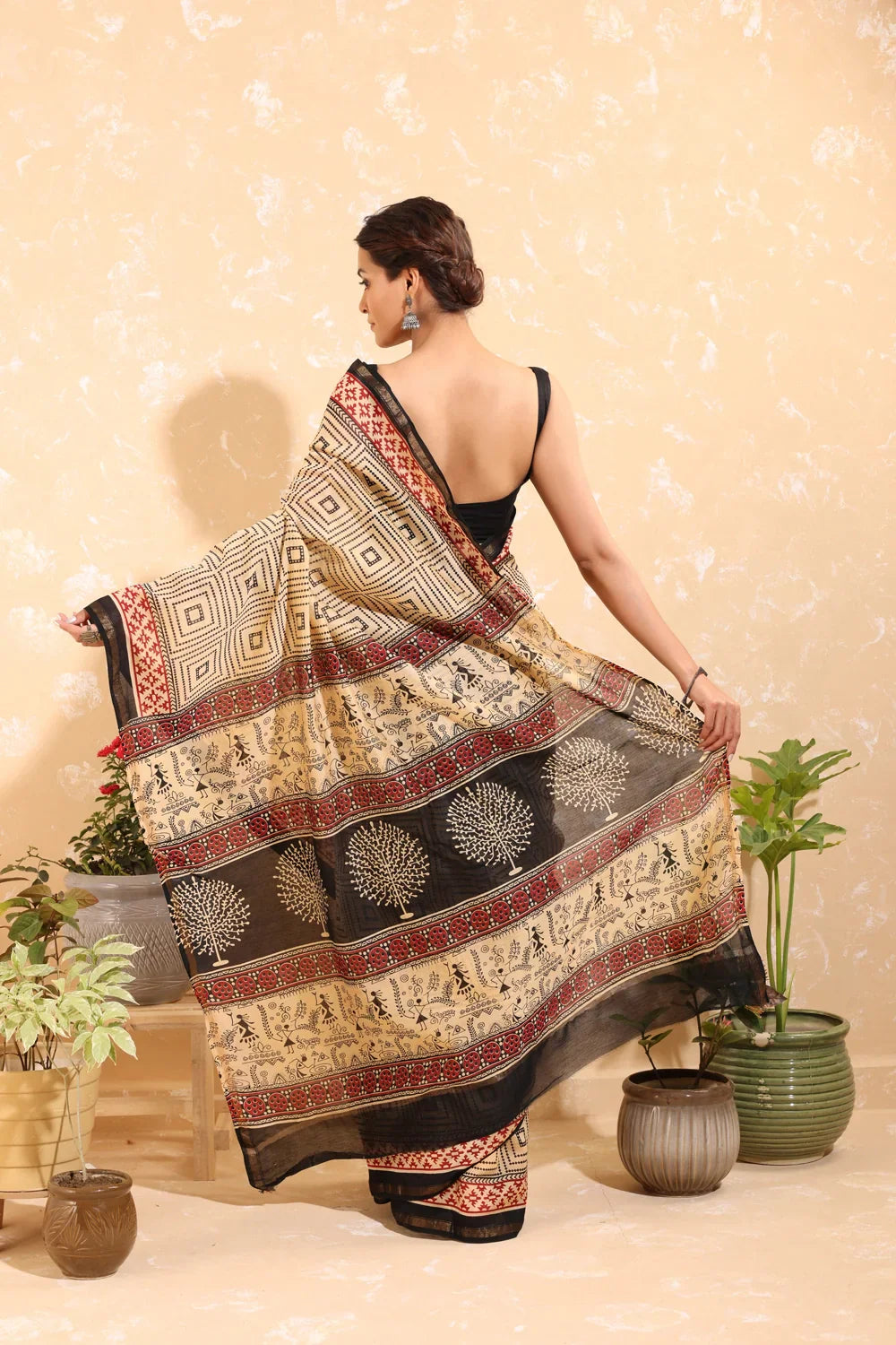 Handloom Tan Brown Block Print Chanderi Cotton Saree