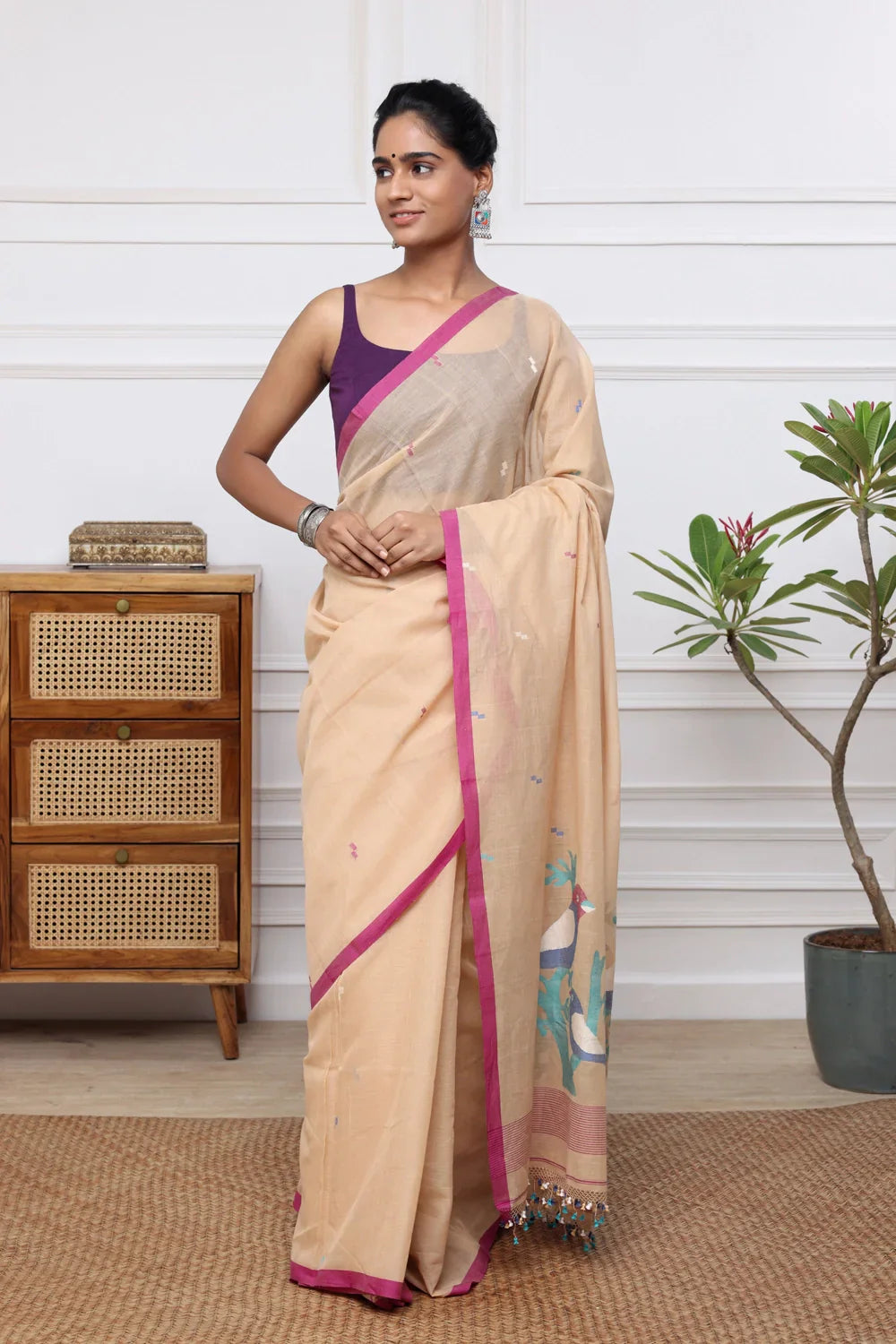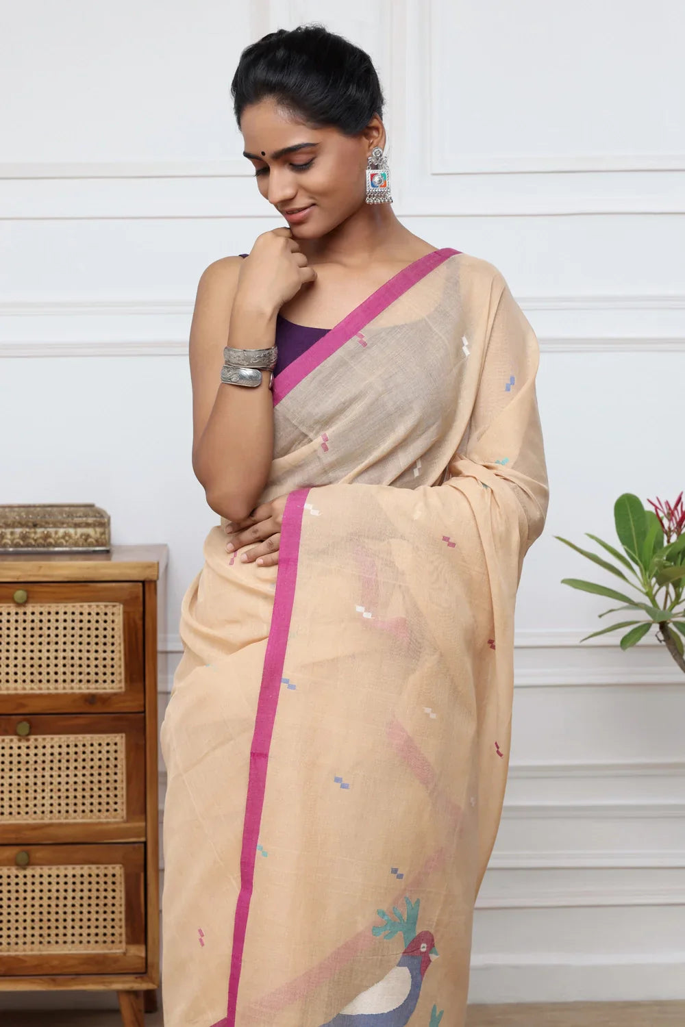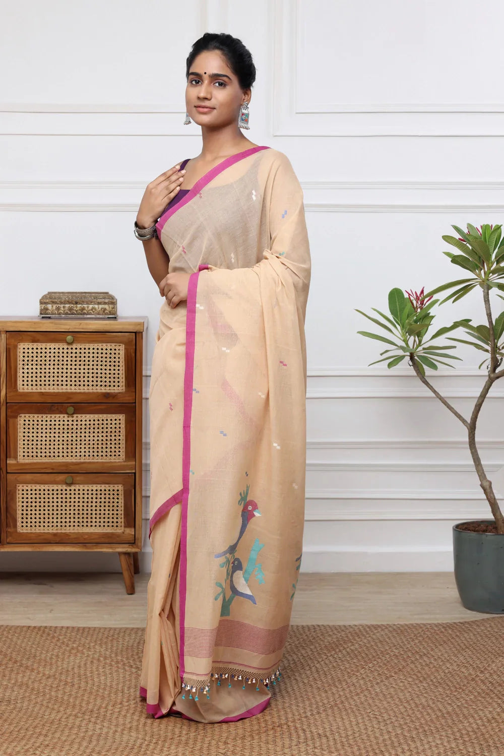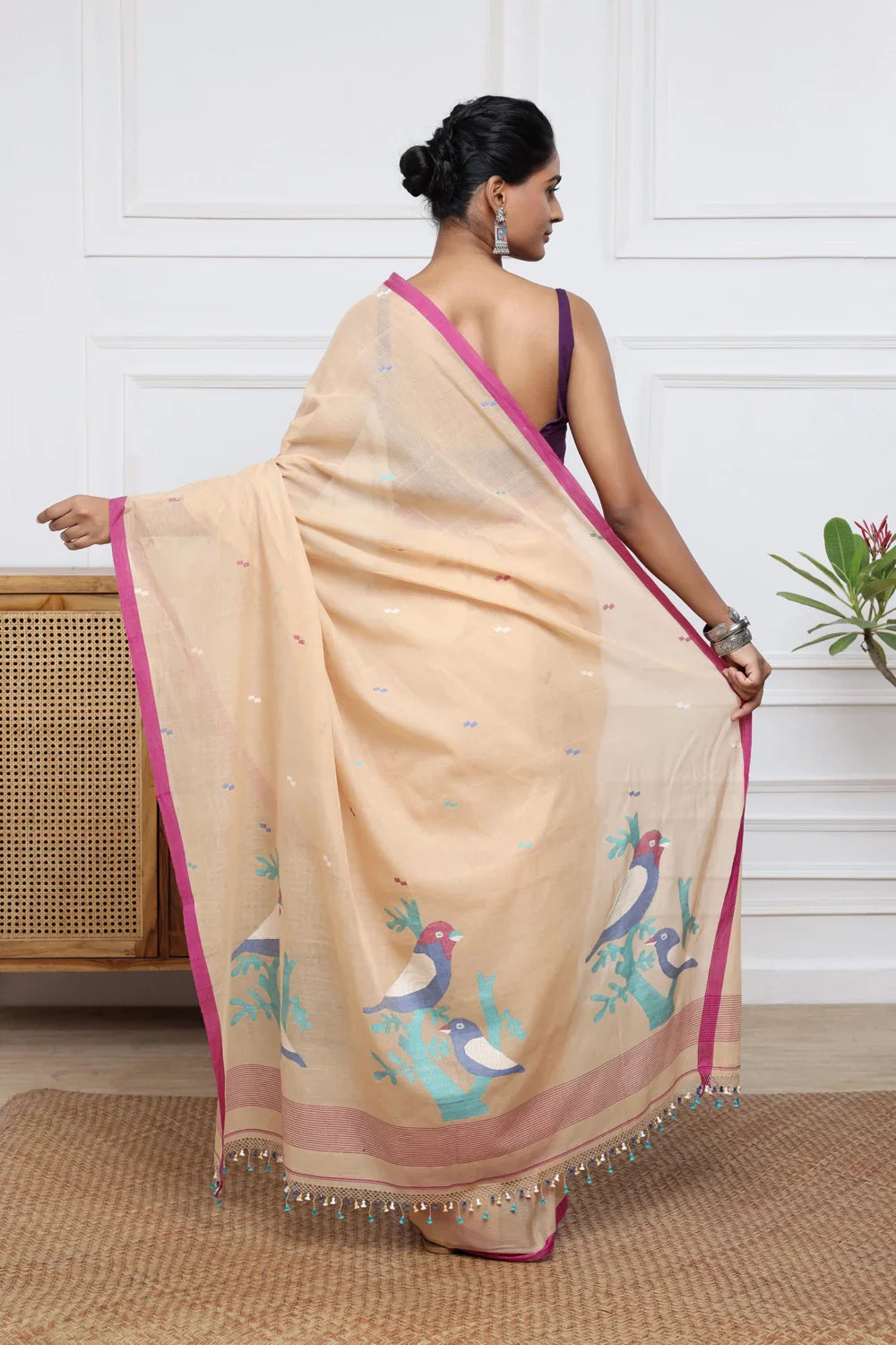 Embrace the charm of Handloom Tan Brown Soft Cotton Jamdani adorned with lively multi-color bird motifs. Each piece showcases meticulous craftsmanship and cultural richness, offering comfort and sophistication. Explore our collection to discover the beauty of handloom textiles, perfect for those who admire traditional artistry with a modern twist.