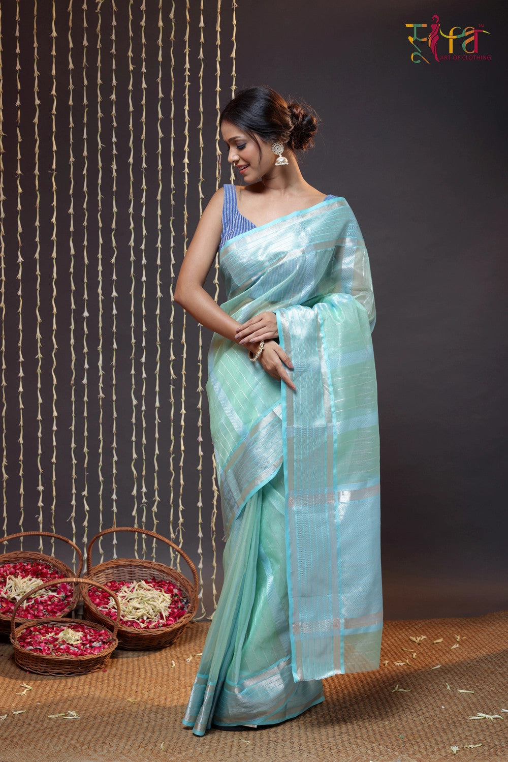Discover the allure within our Handloom Turquoise Katan Silk Saree—a captivating expression of sophistication. This saree introduces a vivid turquoise Katan silk intricately woven with silver zari stripes, forming a captivating play of colors and textures. The marriage of vibrant turquoise and gleaming silver zari imparts a sense of refinement, making it a versatile choice for diverse occasions. Unveil the timeless elegance of Chanderi weaving, seamlessly merging tradition with contemporary charm. Envelop yourself in this masterpiece, embracing the irresistible charm of a saree that transcends mere attire to become a true piece of artistry.