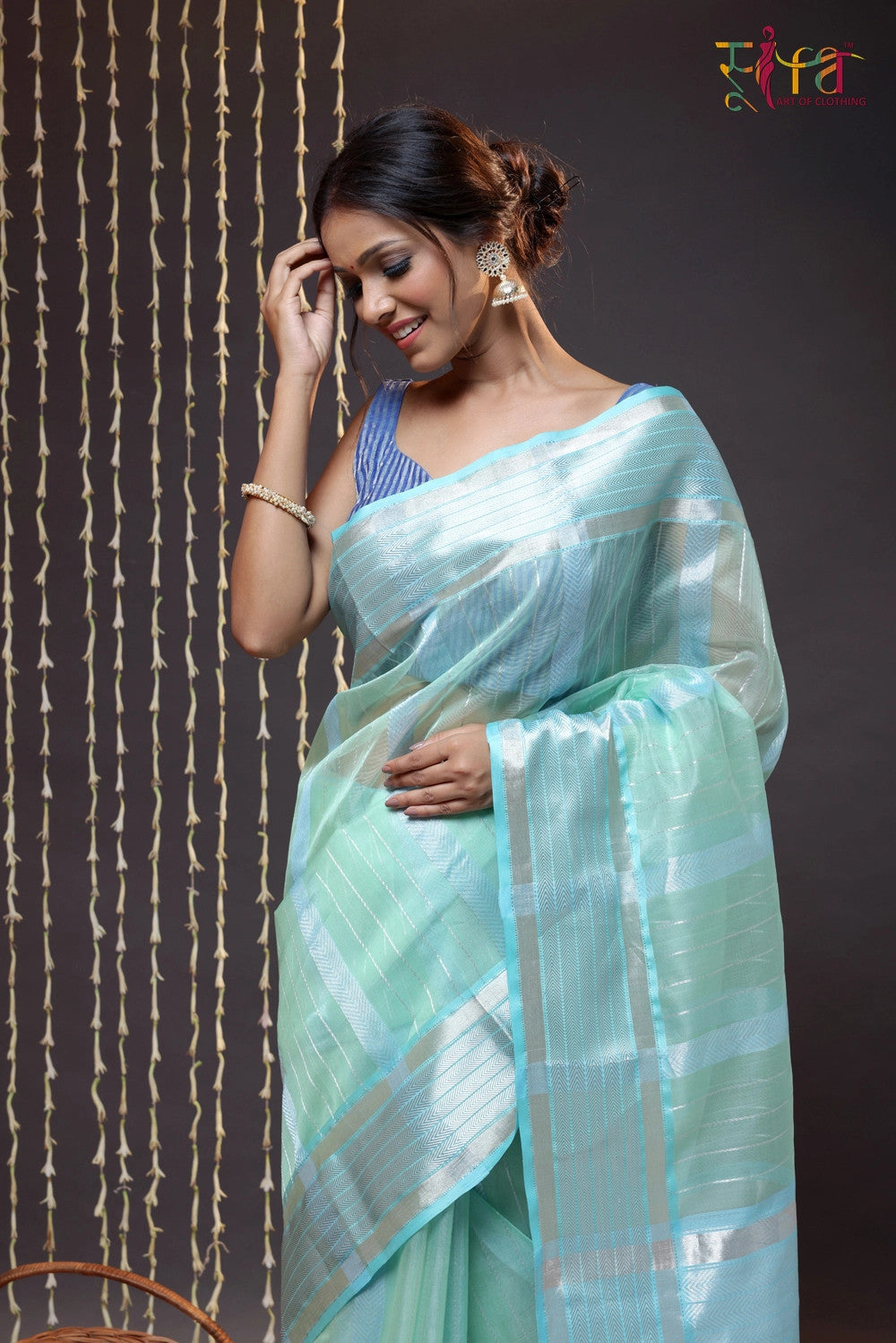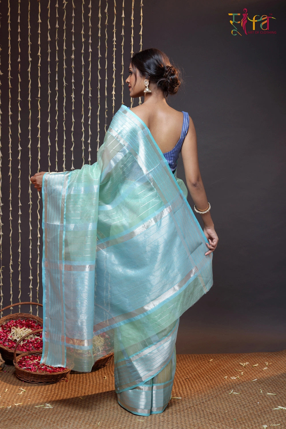 Handloom Turquoise Katan Silk Saree Woven With Zari Stripes