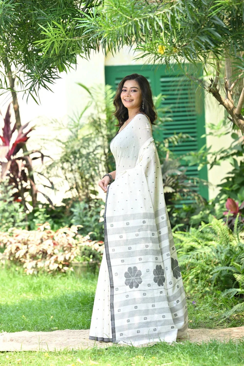 Experience timeless elegance with our Handloom White Soft Cotton Jamdani Saree, featuring intricate black motifs woven throughout the body and delicate floral motifs adorning the pallu, all framed by a sleek black border. Meticulously crafted, this saree exudes sophistication and grace. The classic white backdrop provides a versatile canvas for the striking motifs. Crafted from soft cotton, it ensures comfort and style with every drape. Elevate your wardrobe with this exquisite piece, seamlessly blending tradition with modern allure. Explore our collection and immerse yourself in the beauty of handloom craftsmanship