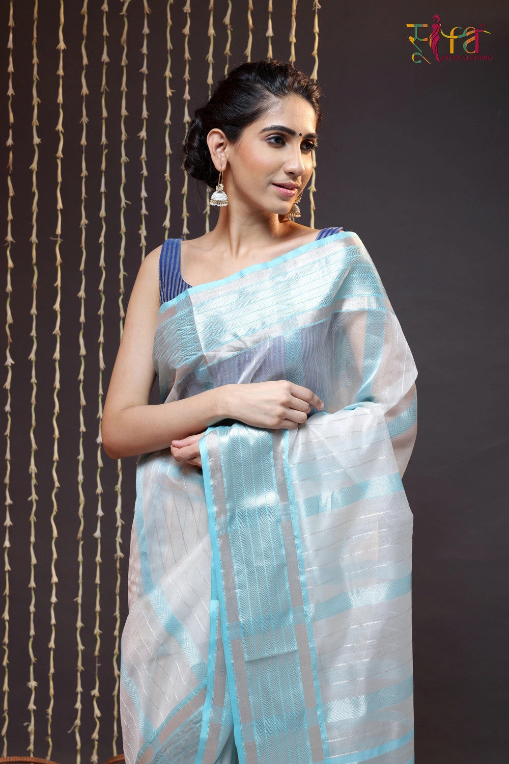 Discover the allure of our Handloom White Katan Silk Saree—a tribute to refined elegance. This saree showcases pristine white Katan silk adorned with meticulously woven sky blue-colored silver zari stripes. The delicate interplay of colors forms a sophisticated and versatile look suitable for various occasions. The sky blue border, enhanced with silver zari accents, adds an extra layer of sophistication, completing the ensemble impeccably. Immerse yourself in the luxury of Chanderi weaving, where each thread narrates a story of tradition and grace. Embrace the charm of this masterpiece and elevate your style with timeless beauty.