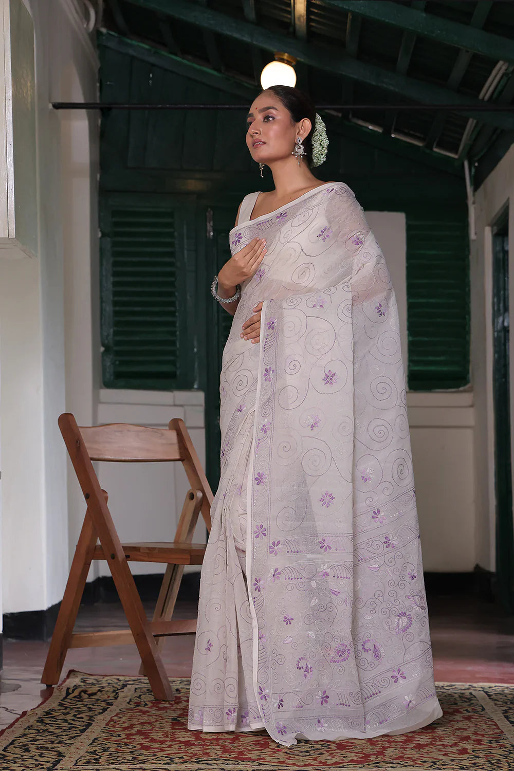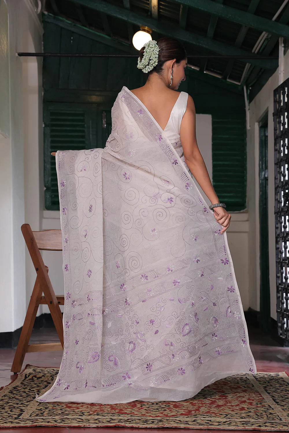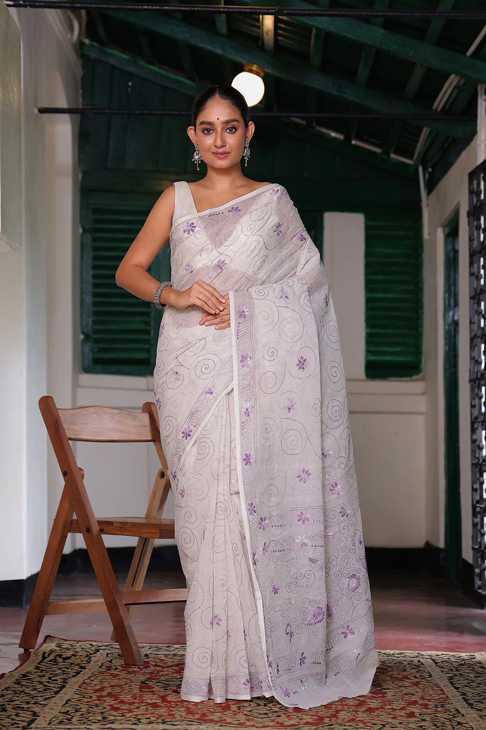 The Handloom White Pure Cotton Kantha Saree is a timeless blend of tradition and elegance. Crafted with intricate Kantha embroidery, this pure cotton saree offers both comfort and sophistication. Its handwoven texture and delicate detailing make it perfect for any occasion, adding a touch of heritage and grace to your wardrobe. Embrace the beauty of handcrafted luxury.