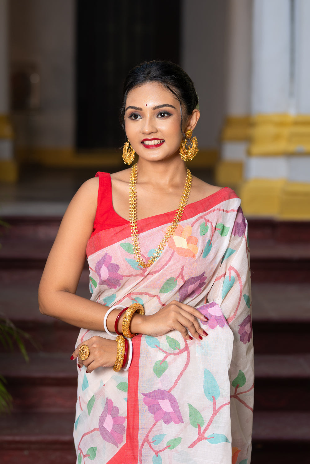 Handloom White & Red Pure Cotton Multi Colour Floral Motifs Jamdani Saree