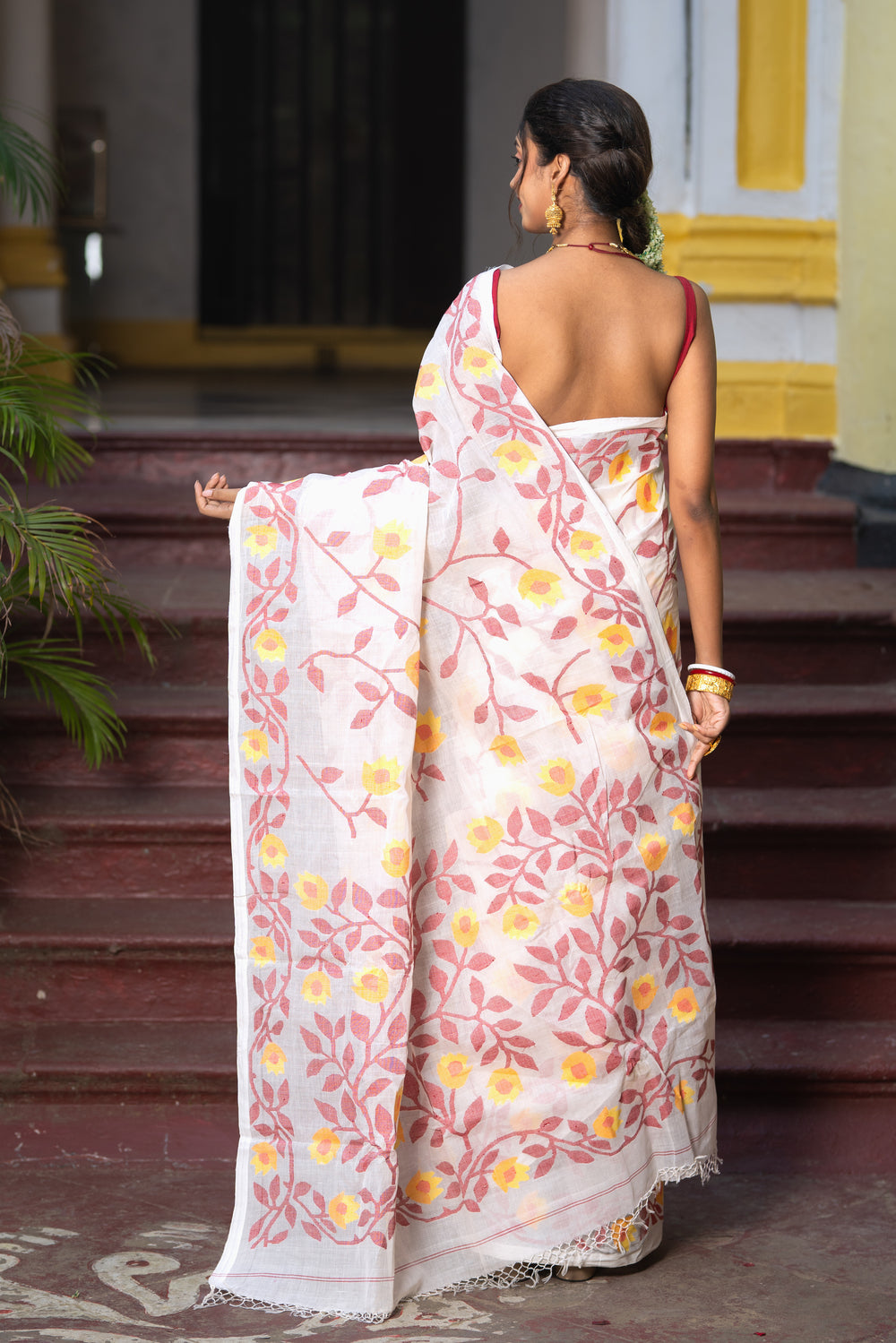 Handloom White & Red Pure Cotton Yellow Floral Motifs Jamdani Saree
