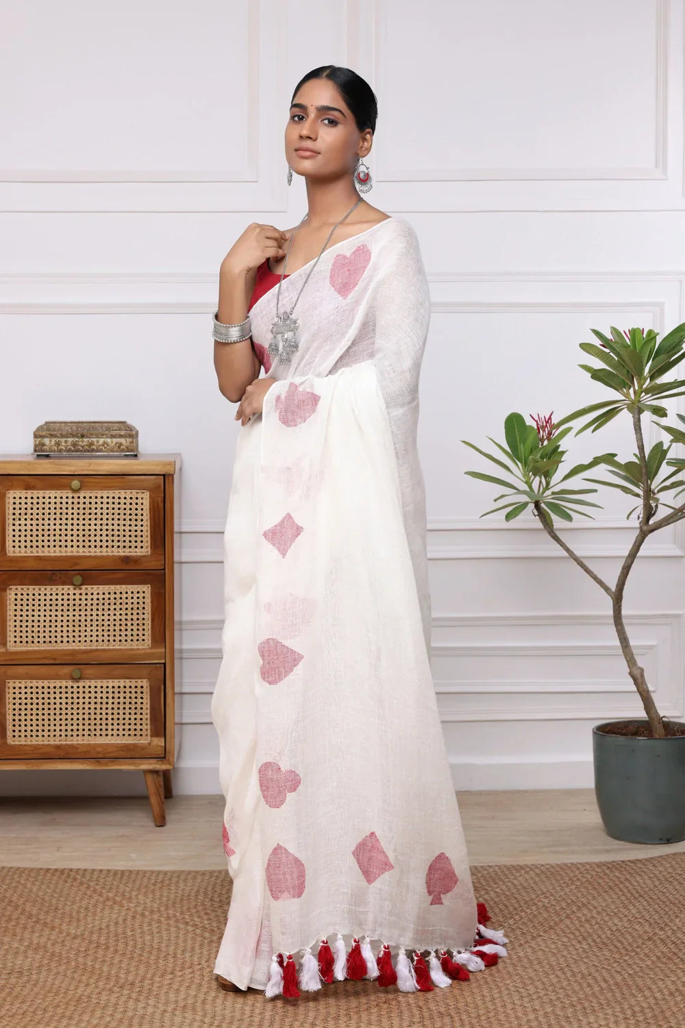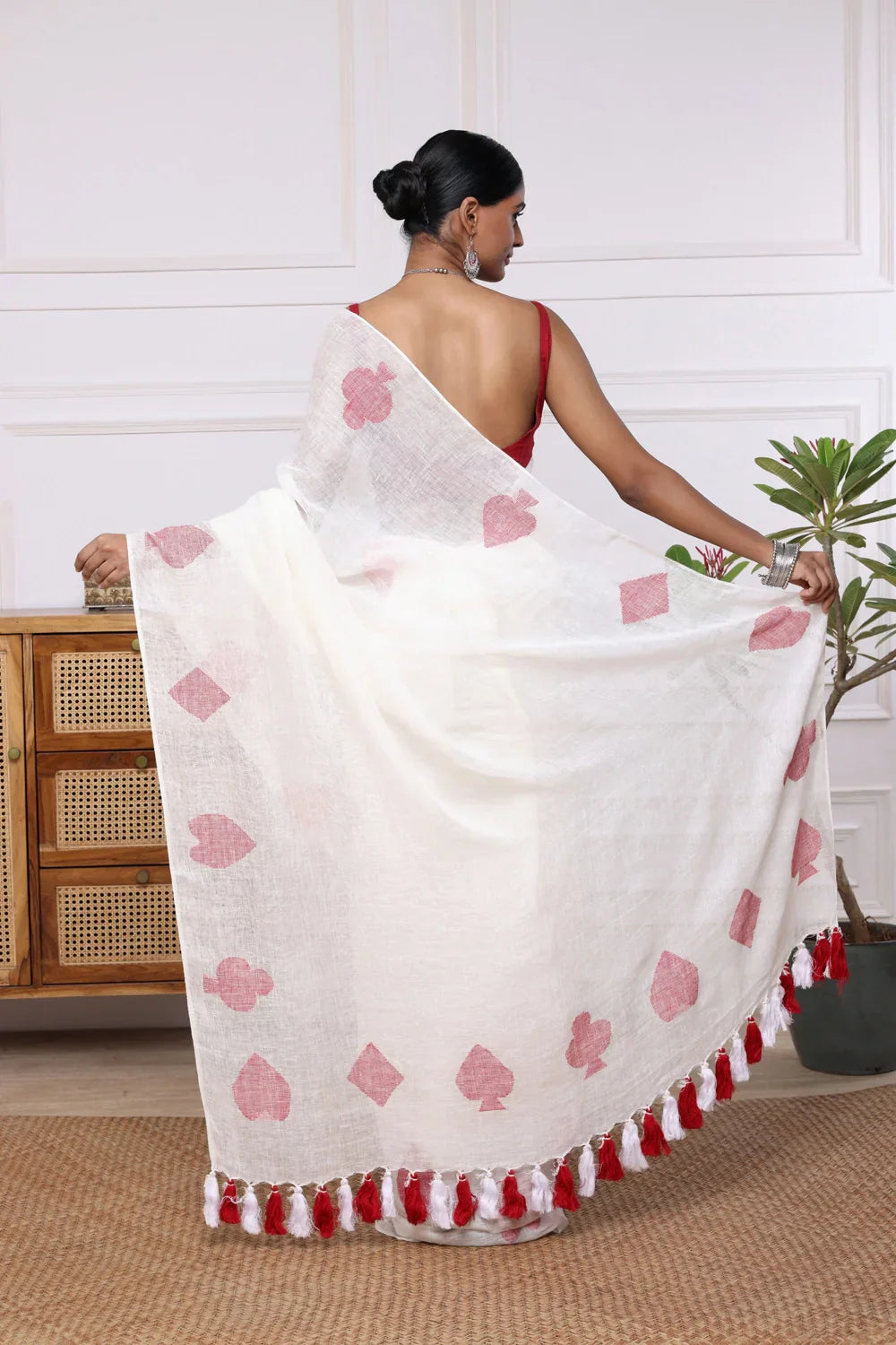 Handloom White & Red Pure Linen Teen Patti Jamdani Saree