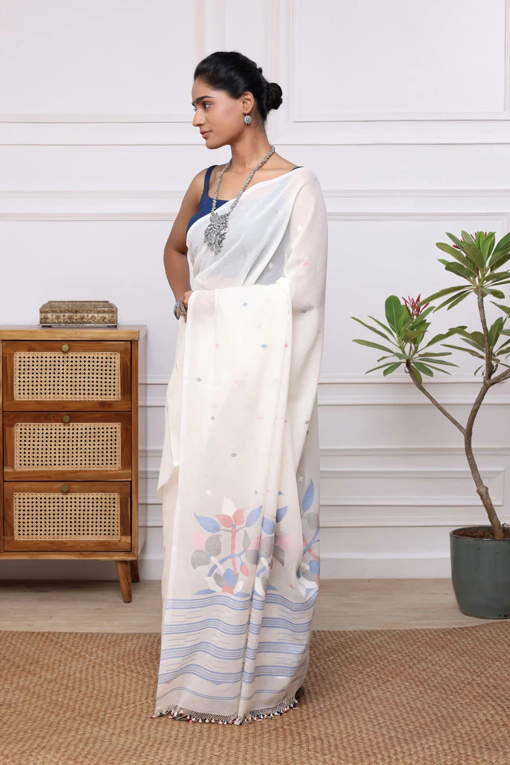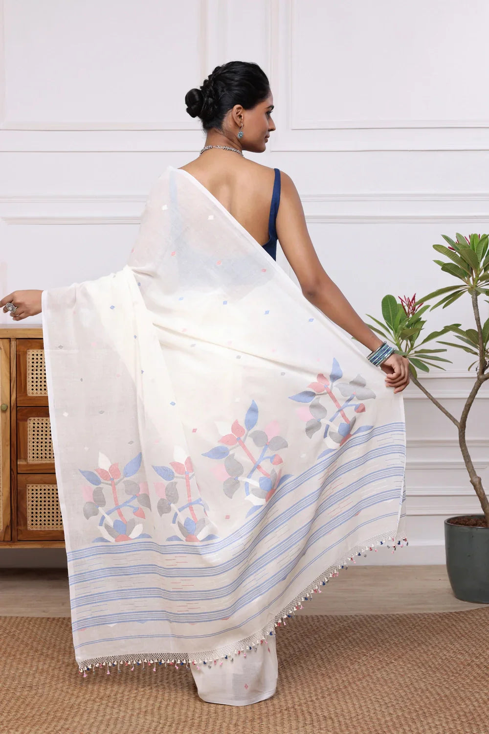 Handloom White Soft Cotton Jamdani with Floral Motifs