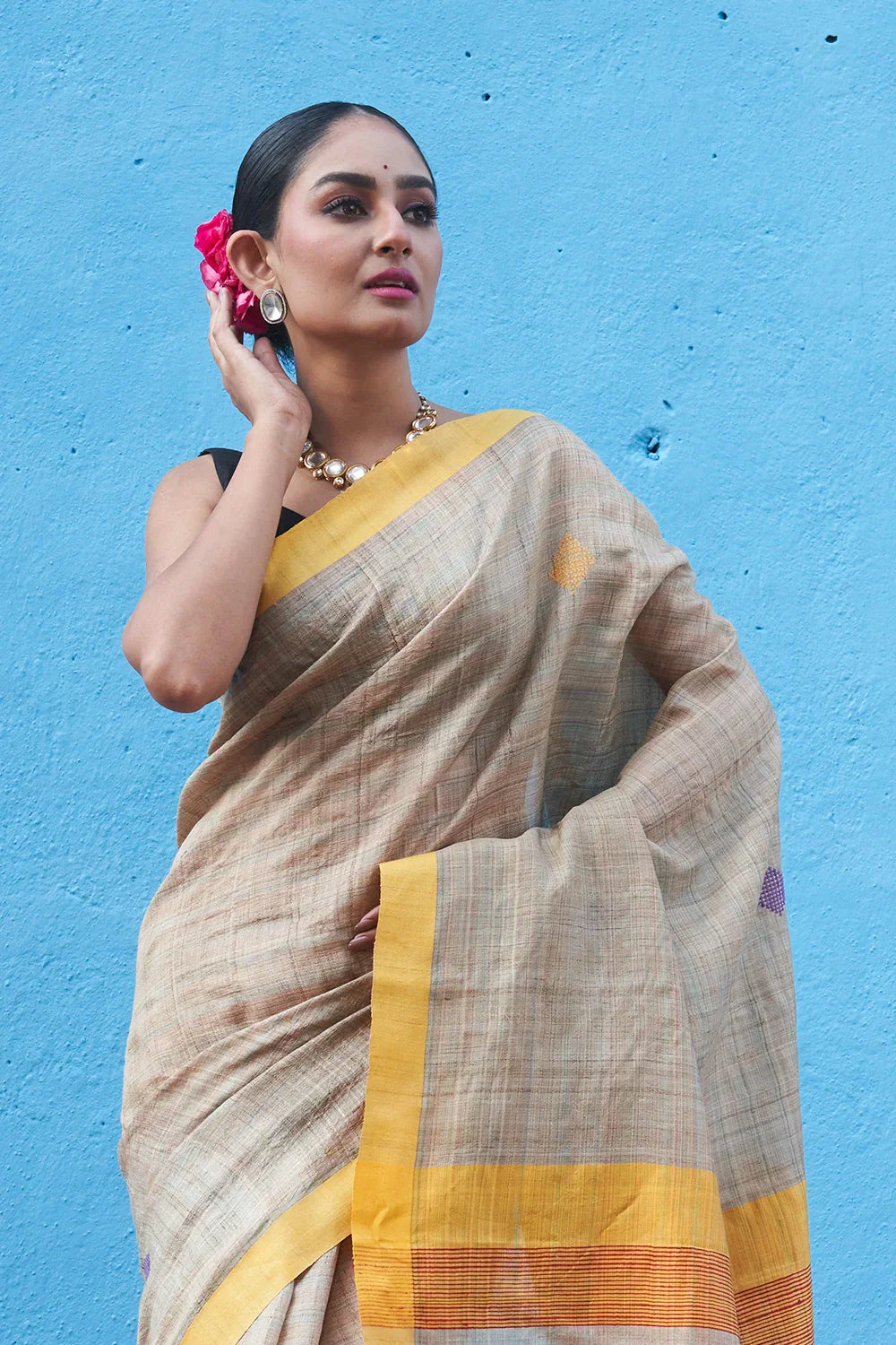 Handloom Yellow Multi-Colour Pure Tussar Silk Saree, a symbol of elegance and luxury. Crafted with meticulous care, this saree features a vibrant palette of multi-coloured accents, adding depth and character to the lustrous yellow silk fabric. The natural texture of Tussar silk adds a touch of sophistication, making it perfect for special occasions. Elevate your style with this exquisite piece, showcasing the timeless beauty and allure of handloom craftsmanship. Flaunt your individuality and grace with this stunning saree that promises to captivate attention wherever you go.