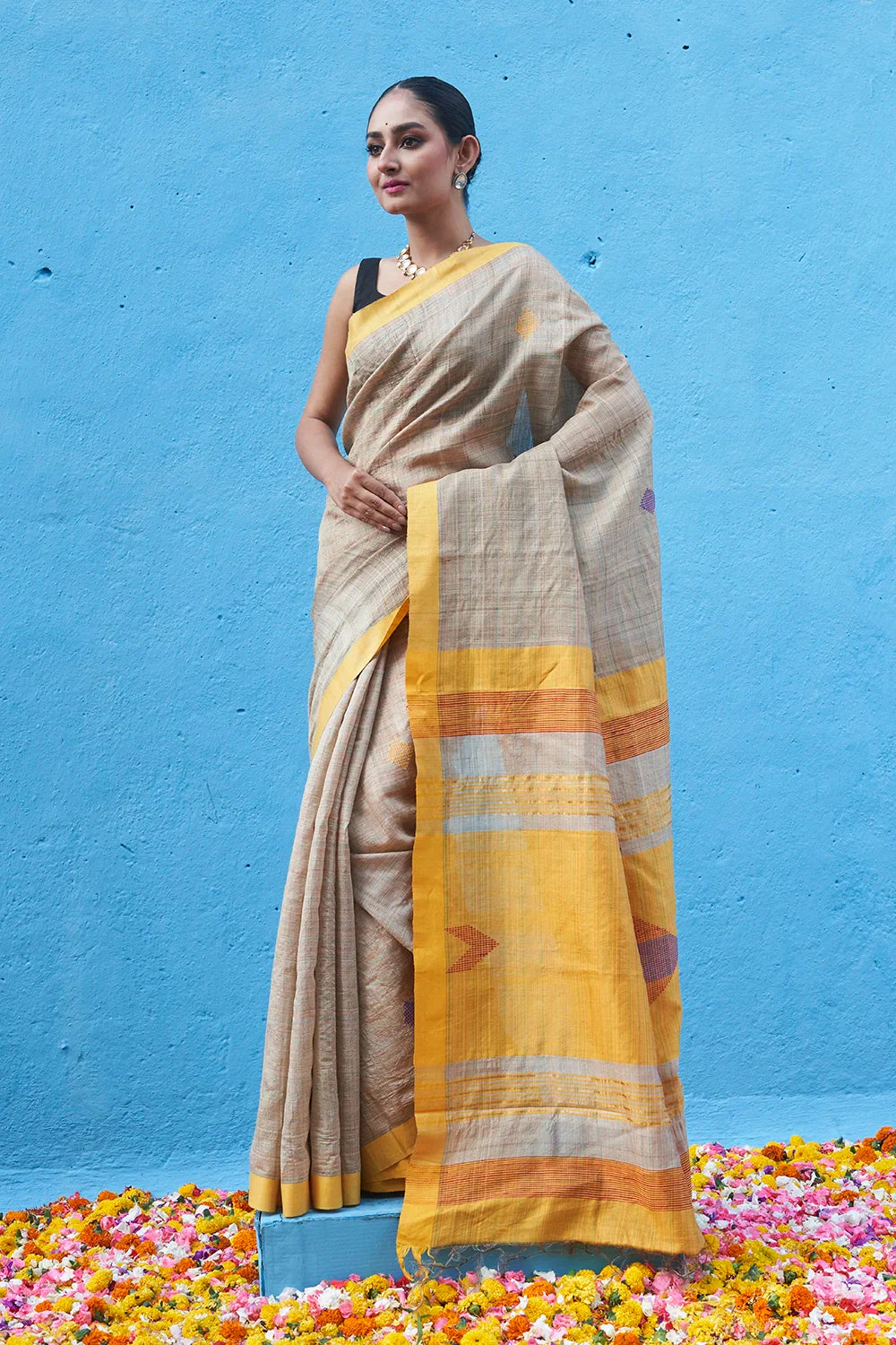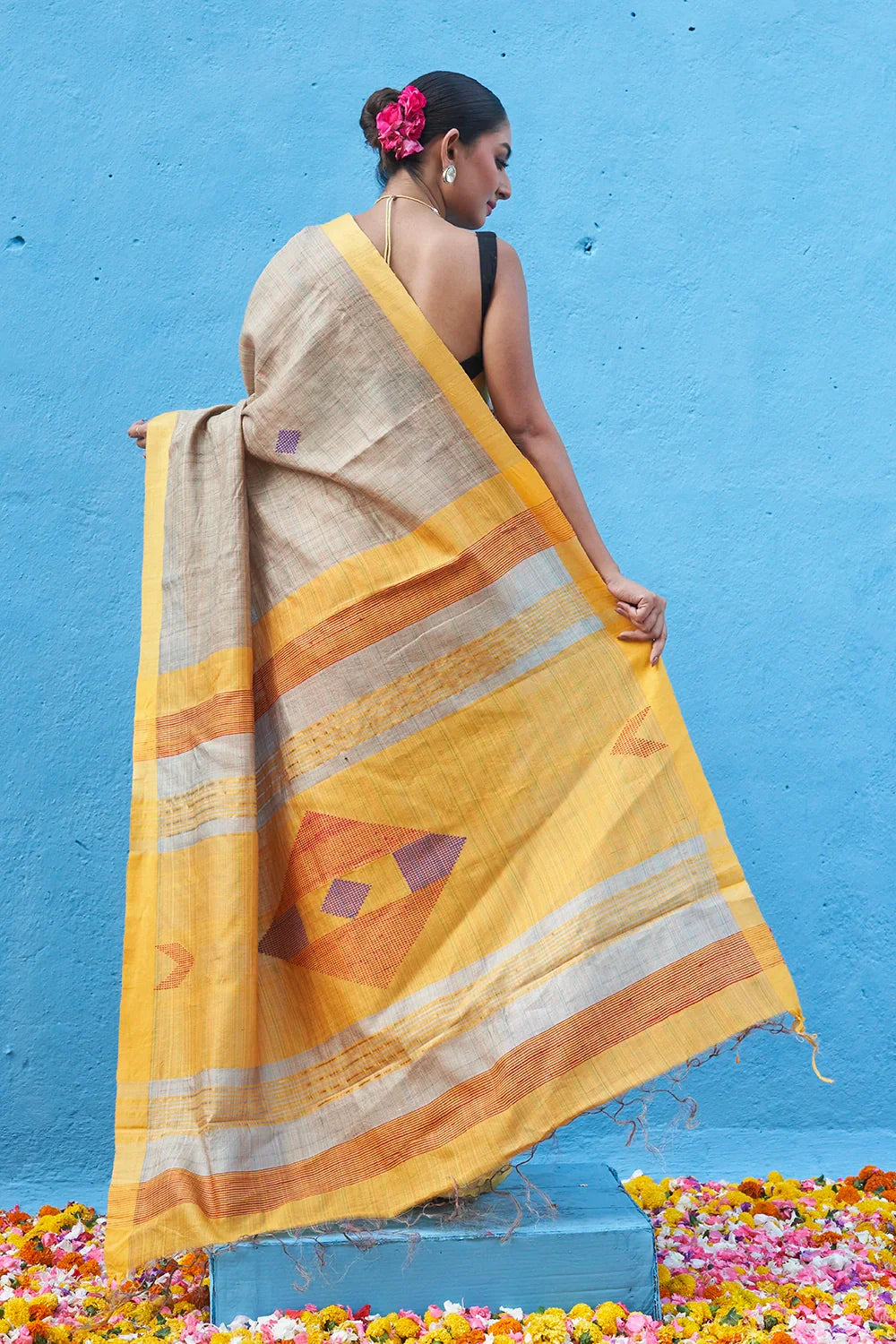 Handloom Yellow Multi Colour Pure Tussar Silk Saree