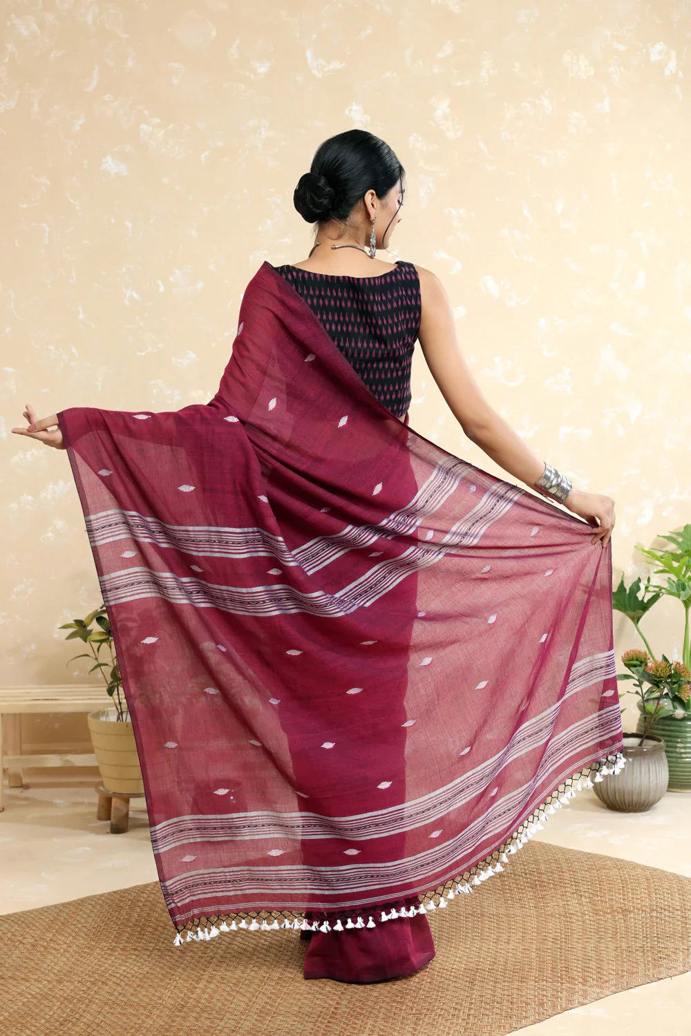 Handloom Wine Mulmul Saree with Tassels