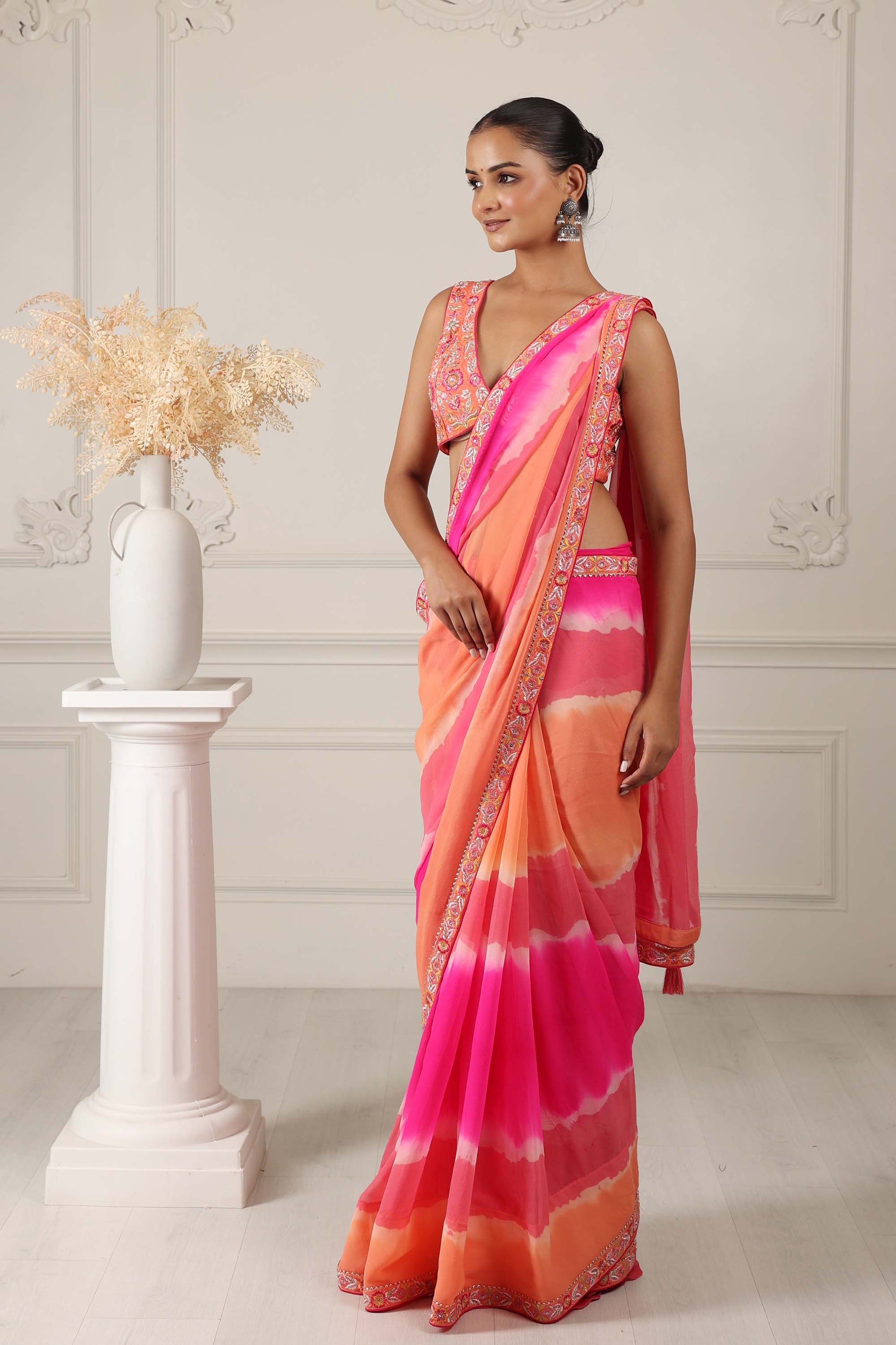 Featuring Tie& dye Orange silk georgette embroidered embroidered saree with embroidered viscose dupion blouse